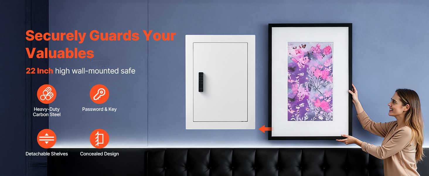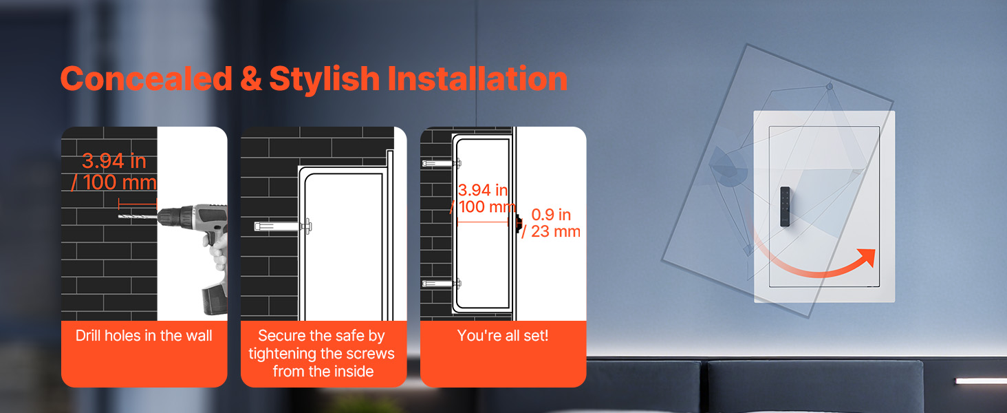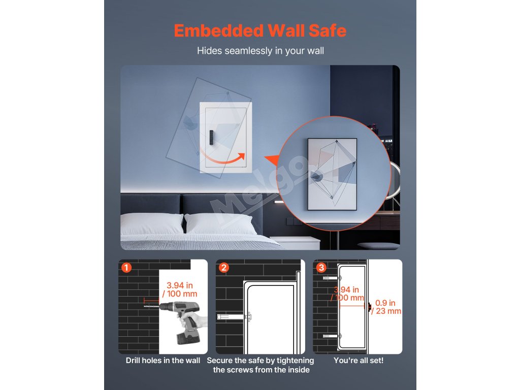 Tento skrytý nástenný trezor je navrhnutý na montáž na stenu, takže sa ľahko zapustí do vašej steny a získa elegantný, skrytý vzhľad. Po inštalácii dokonale splynie s vaším interiérom a zároveň poskytne spoľahlivú ochranu vašich cenností.