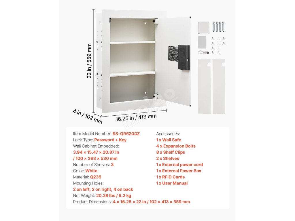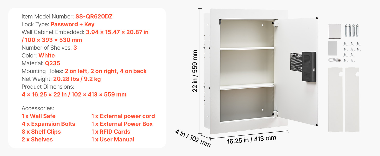 Náš nástenný trezor je vyrobený z odolnej uhlíkovej ocele a poskytuje silnú odolnosť voči vonkajšej sile. Je vybavený dvojitým odomykaním pomocou hesla a karty na jednoduchý prístup. Odnímateľná polica umožňuje nastaviteľné uloženie rôznych predmetov. Skrytá konštrukcia udržiava cennosti v bezpečí.
