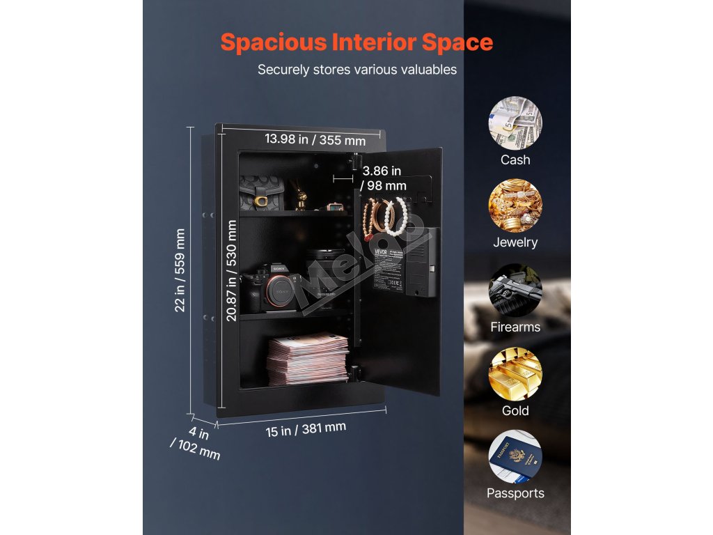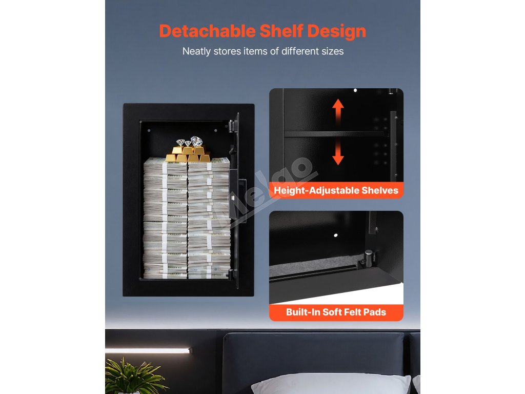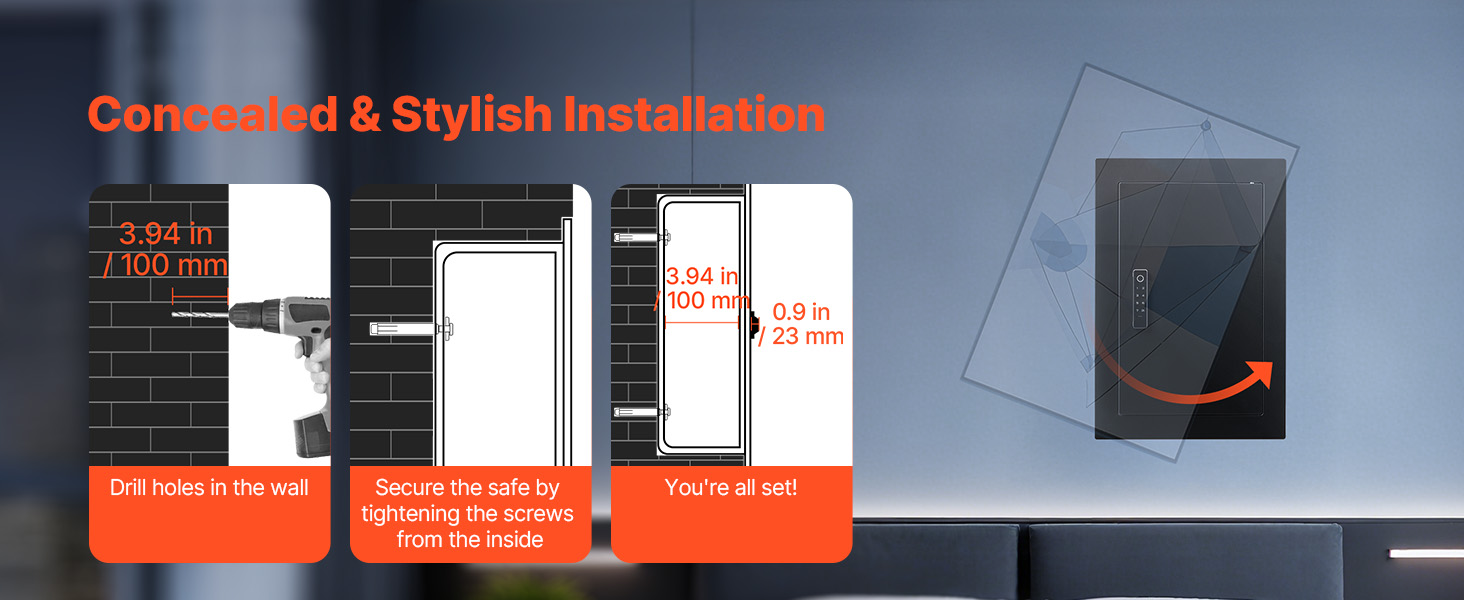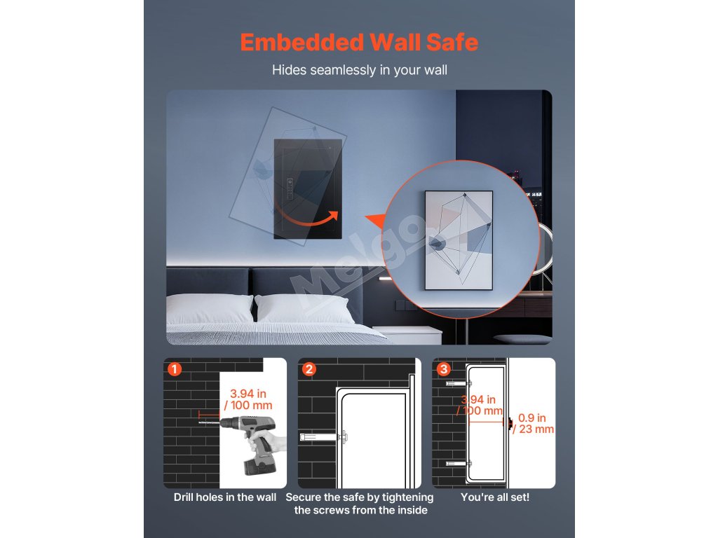 Tento skrytý nástenný trezor je určený na montáž na stenu, takže sa ľahko zapustí do vašej steny a získa elegantný, skrytý vzhľad. Po inštalácii dokonale splynie s vaším interiérom a zároveň poskytne spoľahlivú ochranu vašich cenností.
