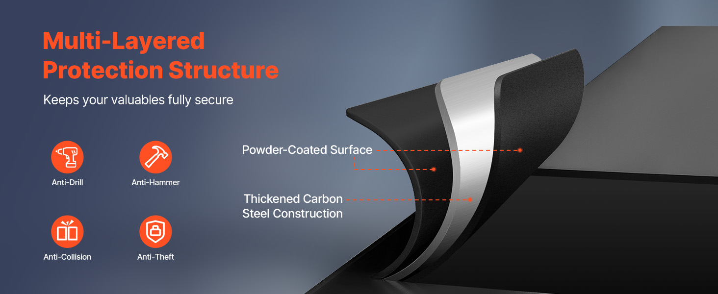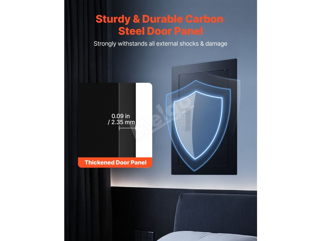 Tento trezor do steny vyrobený zo zosilnenej uhlíkovej ocele odolá vŕtačkám, kladivám a iným vonkajším nárazom, aby cennosti zostali v bezpečí. Povrchová úprava práškovou farbou zvyšuje odolnosť proti korózii a opotrebovaniu, čím zabezpečuje dlhodobú životnosť a spoľahlivosť.