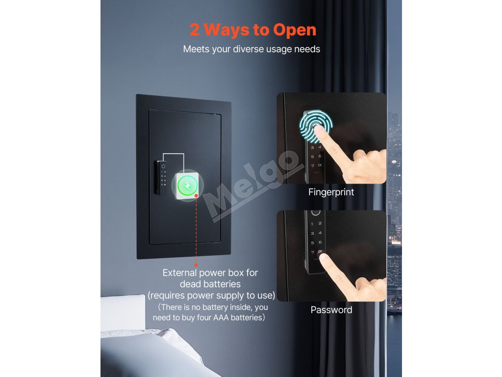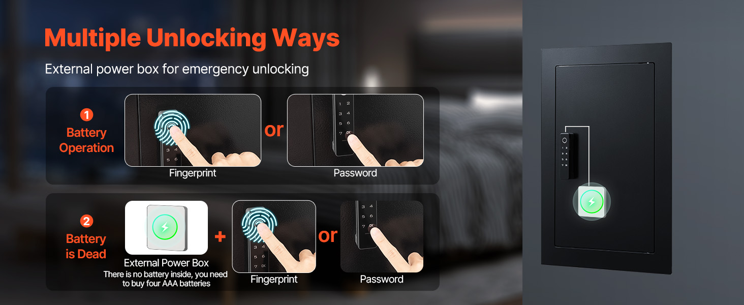 Tento nástenný trezor podporuje viacero spôsobov prístupu. Vďaka batériovému napájaniu môžete použiť núdzový kľúč, 4-15miestny kód alebo odtlačok prsta plus otočný gombík. Ak sa batéria vybije, pripojte externý napájací box a odomknite pomocou kódu alebo odtlačku prsta pomocou otočného gombíka. Núdzový port si na svoju prevádzku vyžaduje napájanie.