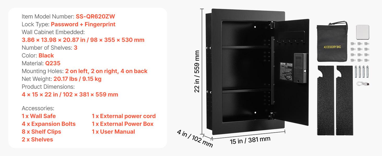 Náš nástenný trezor je vyrobený z odolnej uhlíkovej ocele a je odolný voči vonkajšej sile. Podporuje dve metódy odomykania pomocou hesiel a odtlačkov prstov na jednoduchý prístup. Odnímateľná polica umožňuje nastaviteľné uloženie rôznych predmetov. Skrytá konštrukcia udržiava cennosti v bezpečí.