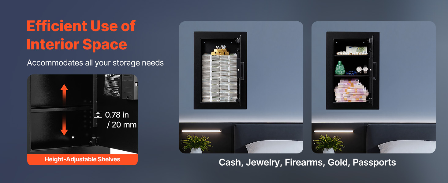 Táto nástenná bezpečnostná schránka je vybavená nastaviteľnou policou, ktorá sa prispôsobí predmetom rôznych veľkostí a typov. Ľahko do nej uložíte hotovosť, šperky, strelné zbrane, zlato alebo pasy, pričom cennosti budú usporiadané a zabezpečené.