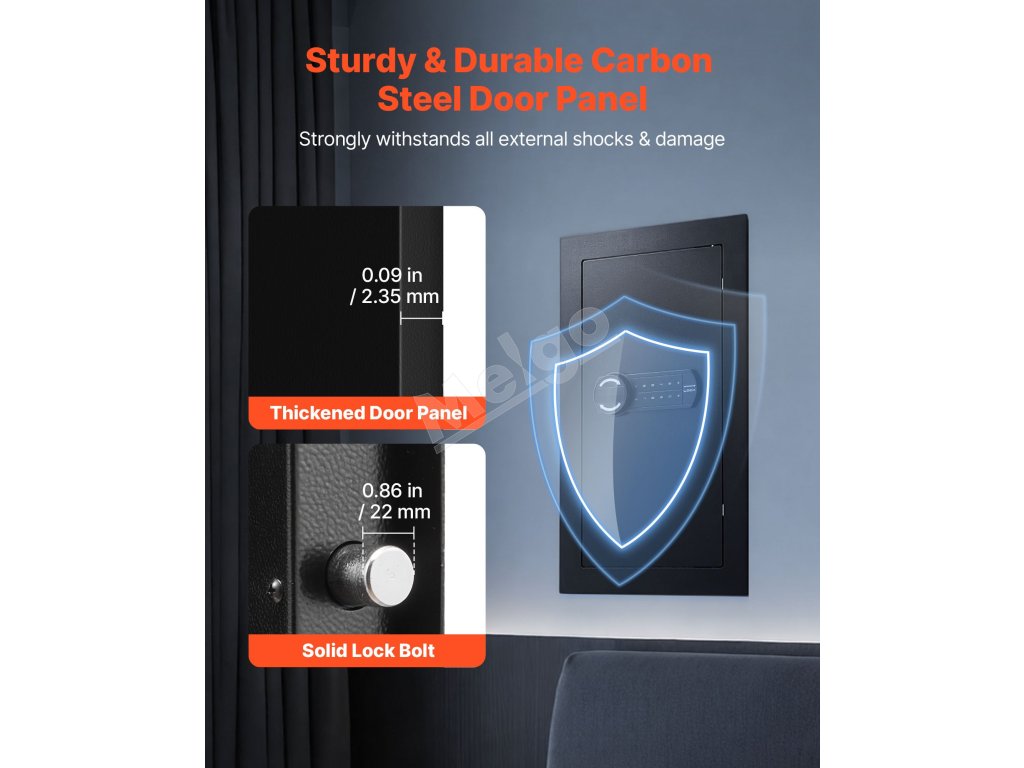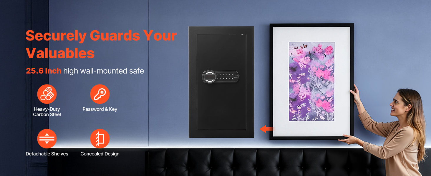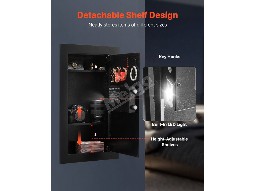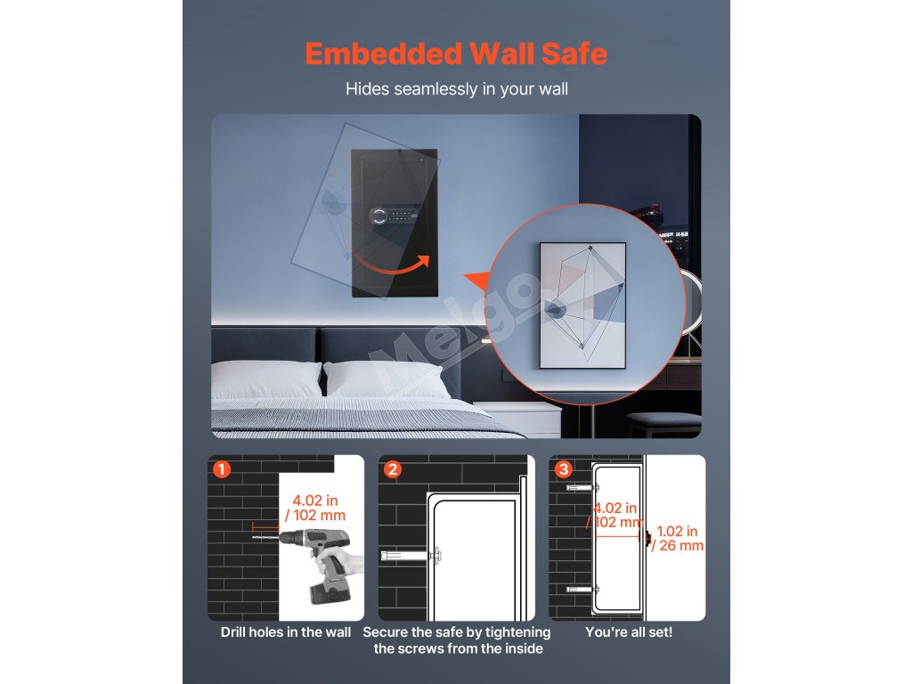 Tento trezor do steny je vyrobený z hrubej uhlíkovej ocele s práškovou povrchovou úpravou, je odolný a štýlový. Je vybavený 2 pevnými uzamykacími skrutkami, zabudovaným LED svetlom pre ľahký prístup a alarmovým systémom proti krádeži, ktorý vás upozorní a poskytne komplexnú ochranu vašich cenností.