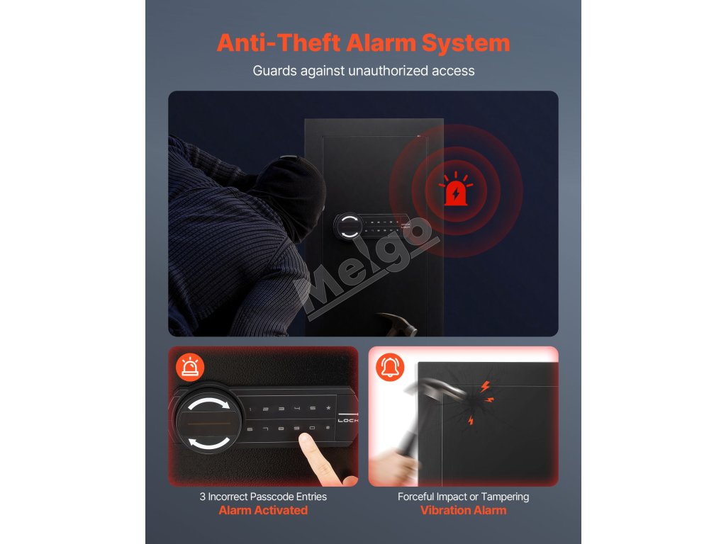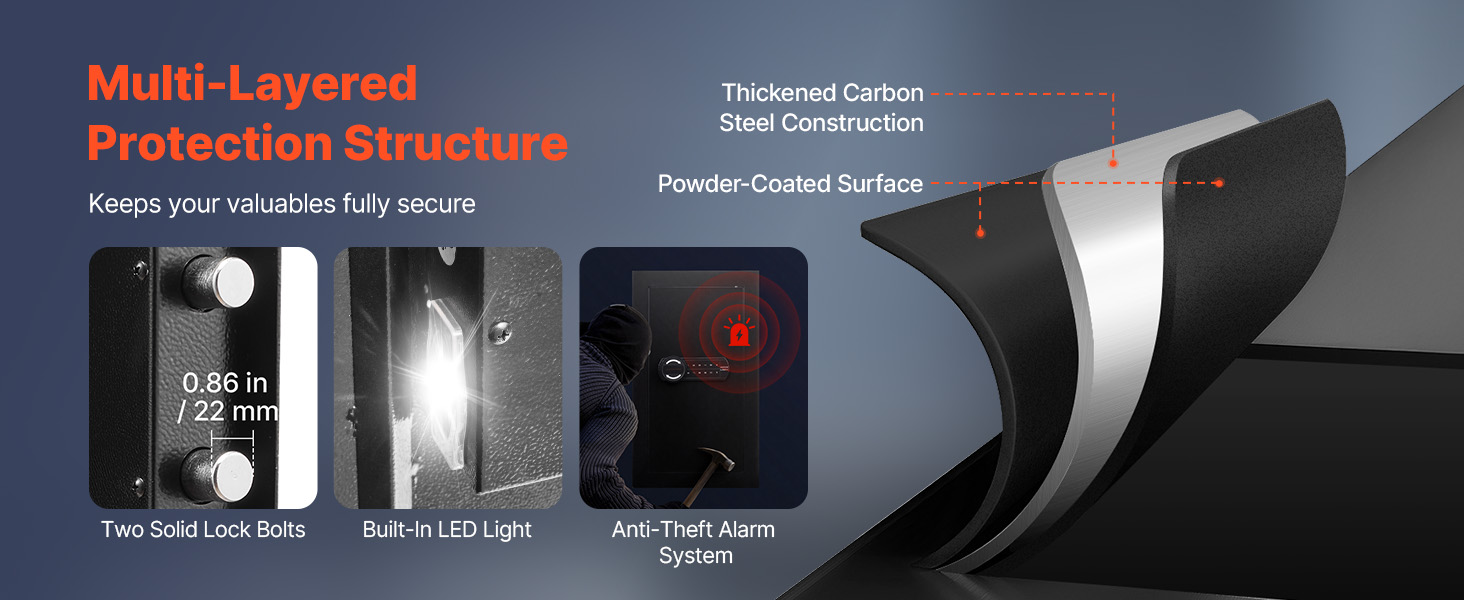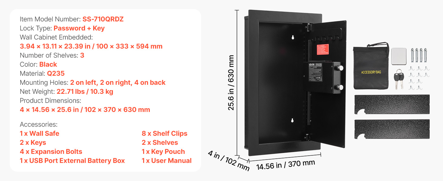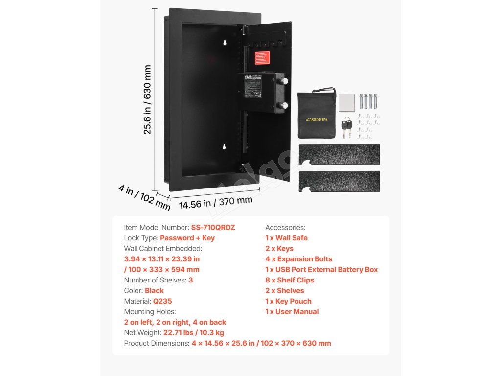 Tento trezor do steny je vyrobený z hrubej uhlíkovej ocele s práškovou povrchovou úpravou, je odolný a štýlový. Je vybavený 2 pevnými uzamykacími skrutkami, zabudovaným LED svetlom pre ľahký prístup a alarmovým systémom proti krádeži, ktorý vás upozorní a poskytne komplexnú ochranu vašich cenností.