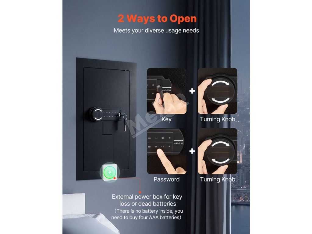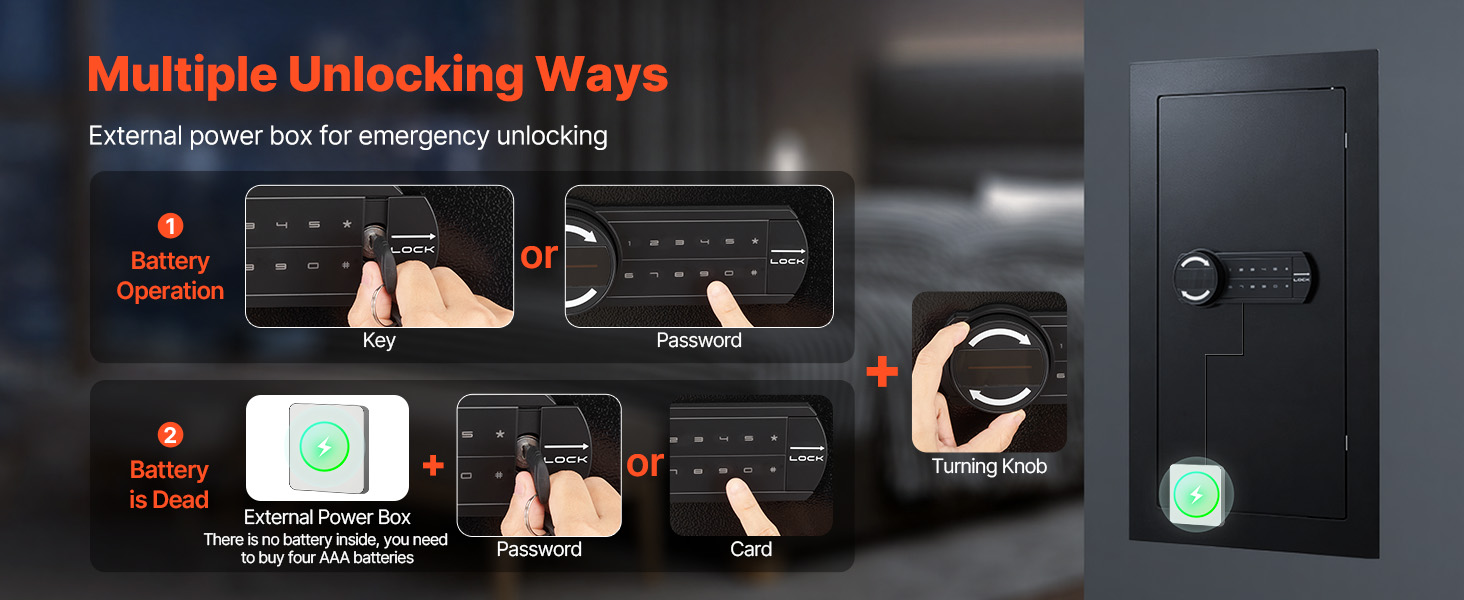 Tento nástenný trezor poskytuje všestranné spôsoby prístupu. Vďaka funkčnej batérii môžete použiť 6-12miestny kód alebo núdzové kľúče s otočným gombíkom. Ak sa batéria vybije, pripojte externý napájací box a odomknite ho pomocou hesla alebo kľúčov. Poznámka: Pri použití hesla musia byť nainštalované batérie.