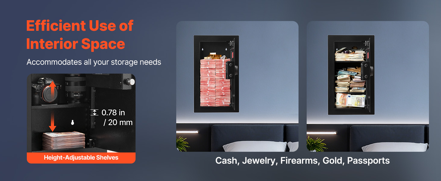 Táto nástenná bezpečnostná schránka je vybavená nastaviteľnou policou, ktorá sa prispôsobí predmetom rôznych veľkostí a typov. Ľahko do nej uložíte hotovosť, šperky, strelné zbrane, zlato alebo pasy a udržíte cennosti v poriadku a v bezpečí.
