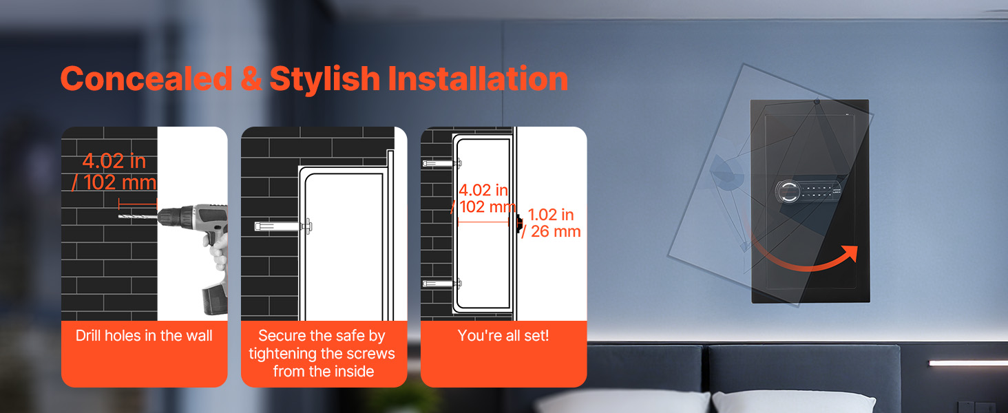 Tento skrytý nástenný trezor je určený na montáž na stenu, takže sa ľahko zapustí do vašej steny a získa elegantný, skrytý vzhľad. Po inštalácii dokonale splynie s vaším interiérom a zároveň poskytne spoľahlivú ochranu vašich cenností.