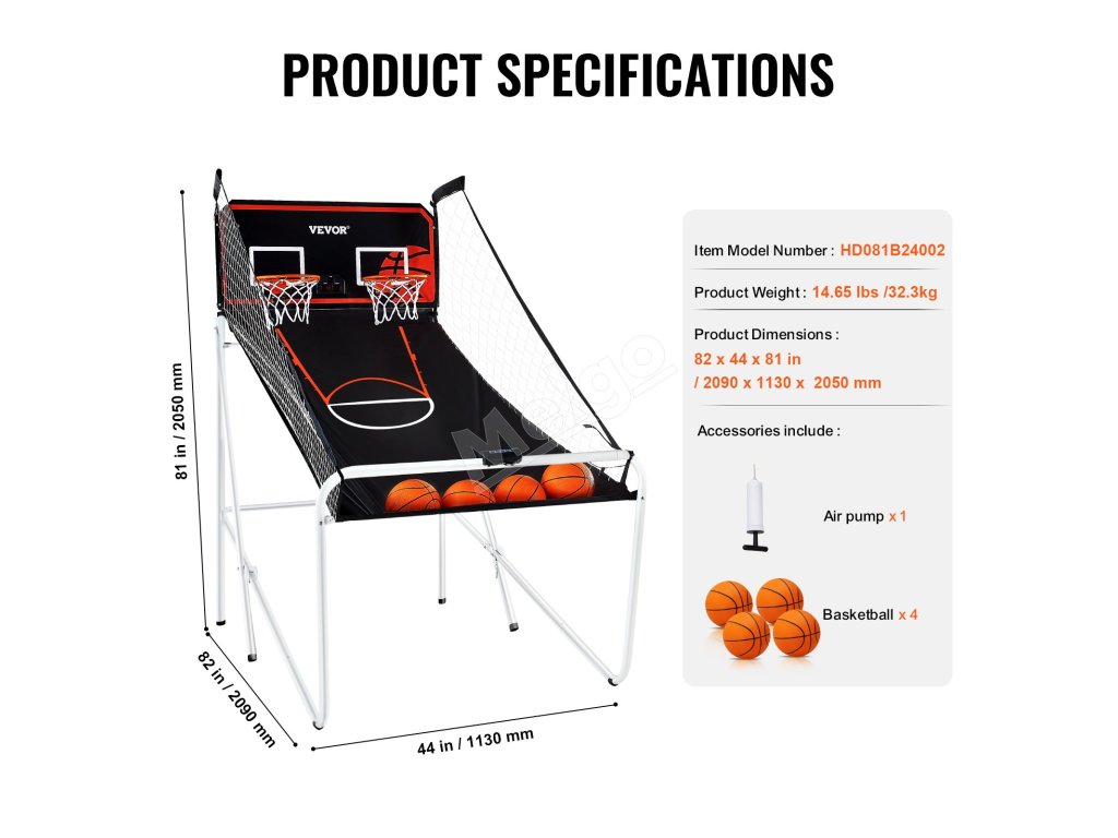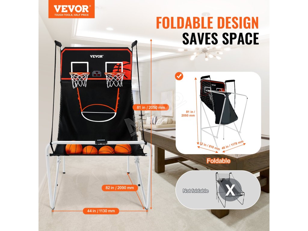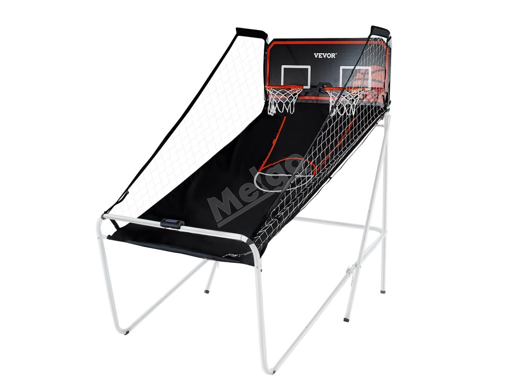 Táto elektronická športová hra s dvojitou streľbou je ideálna do miestností s 8-metrovým stropom, čo umožňuje ľahký let a pohyb lopty po hracej ploche. Vyžaduje 2 dospelé osoby na zostavenie rámu, siete a komponentov zadnej dosky. Toto zariadenie sa dá ľahko zložiť na účely mobility.
