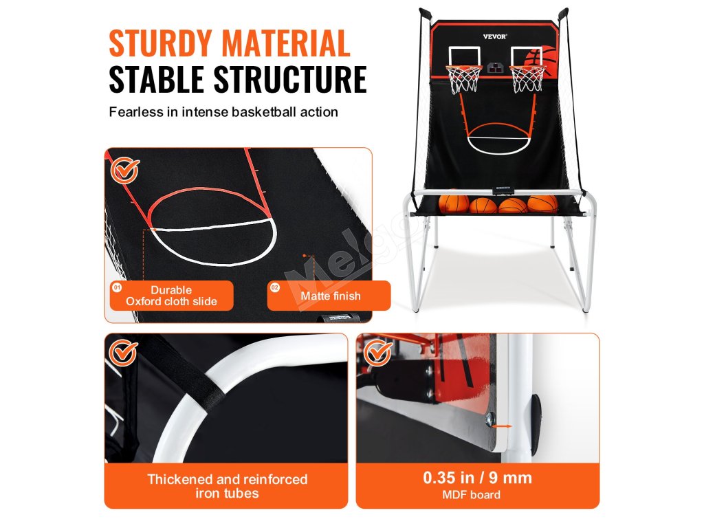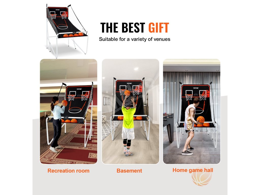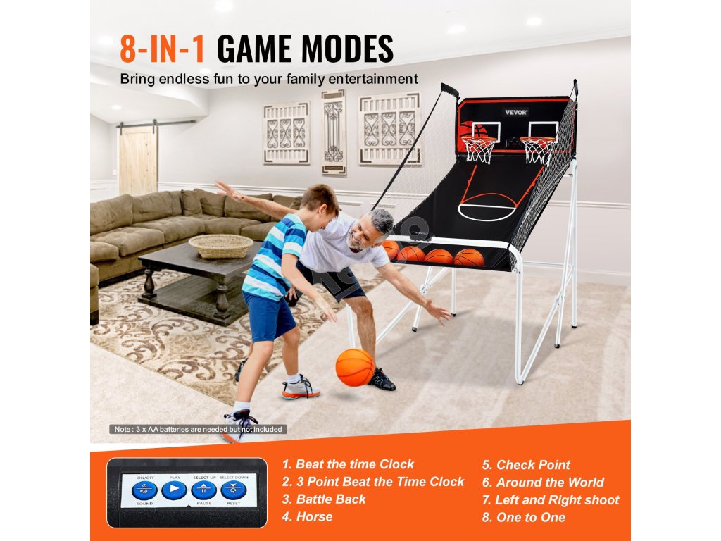 multifunkčná hra 8 v 1 vybavená dvoma basketbalovými bodovacími doskami a časovačom hry, vhodná pre deti aj dospelých hráčov. Rôzne režimy dodajú vašej rodinnej zábave viac zábavy. Vzrušujúce zvukové efekty poskytujú zábavu ako z pravej arkády a užívajte si krásne basketbalové chvíle.