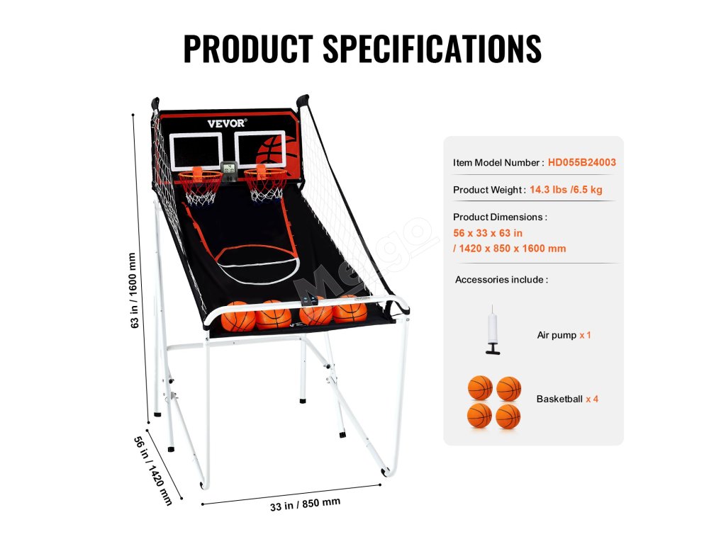 Táto elektronická športová hra s dvojitou streľbou je ideálna do miestností s 8-metrovým stropom, čo umožňuje ľahký let a pohyb lopty po hracej ploche. Vyžaduje 2 dospelé osoby na zostavenie rámu, siete a komponentov zadnej dosky. Toto zariadenie sa dá ľahko zložiť na účely mobility.