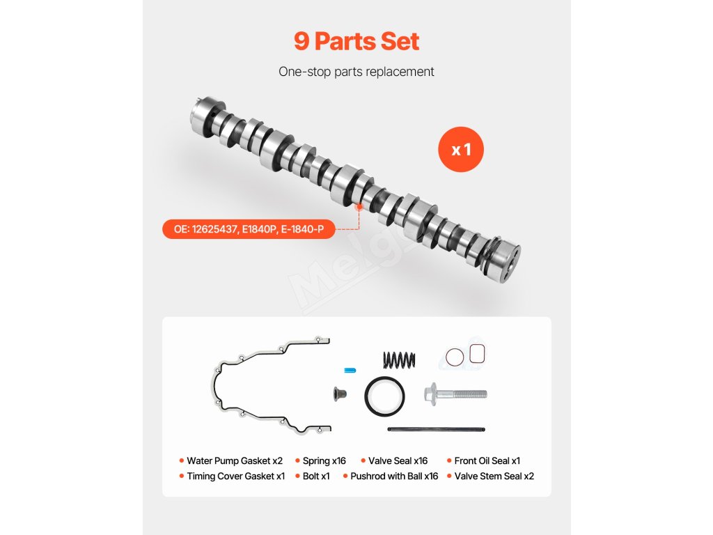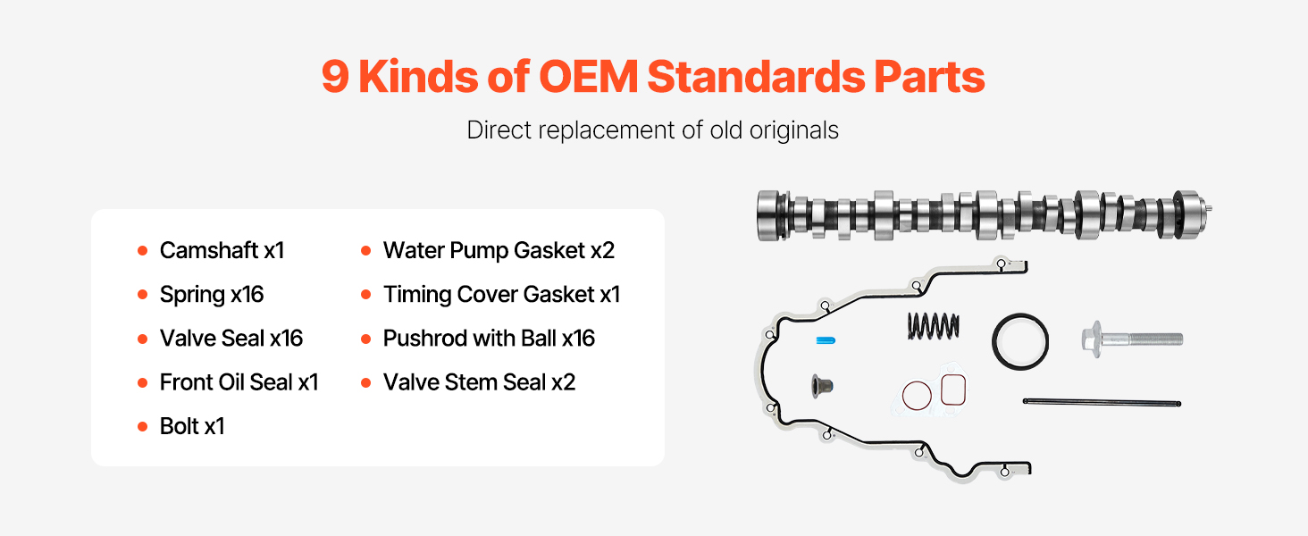 Vzhľadom na možné problémy s inými komponentmi počas procesu výmeny vačkového hriadeľa poskytuje táto súprava vačiek motora kompletnú sadu dielov na zlepšenie vášho plánu výmeny. Všetky diely spĺňajú normy OEM.