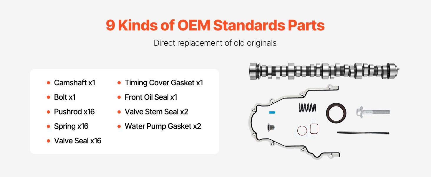 Vzhľadom na možné problémy s inými komponentmi počas procesu výmeny vačkového hriadeľa poskytuje táto súprava vačiek motora kompletnú sadu dielov na zlepšenie vášho plánu výmeny. Všetky diely spĺňajú normy OEM.