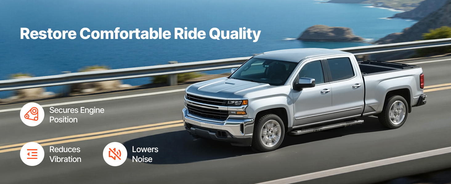 Včasná výmena opotrebovaných dielov pomocou tejto montážnej sady motora obnovuje plynulú jazdu. Udržuje motor pevne na mieste, zabraňuje chveniu počas prevádzky a pohlcuje energiu vibrácií, čím znižuje hluk prenášaný do kabíny pre väčší komfort.