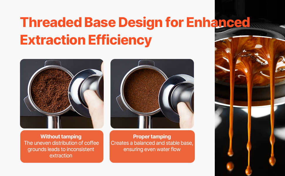 Tamper je vyrobený z potravinárskej nehrdzavejúcej ocele, je odolný voči korózii a ľahko sa čistí. Jeho základňa so závitom zabezpečuje pevné utláčanie, čo vedie k lepšej extrakcii. Konštrukcia odolná voči korózii sa vyznačuje trvanlivosťou a bezpečnosťou.