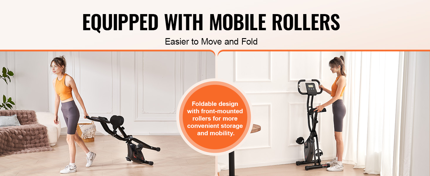 Tento trenažér má skladací dizajn na pohodlné skladovanie a kompaktné šetrenie miesta. Jeho súčasťou sú prepravné kolieska na ľahkú mobilitu.