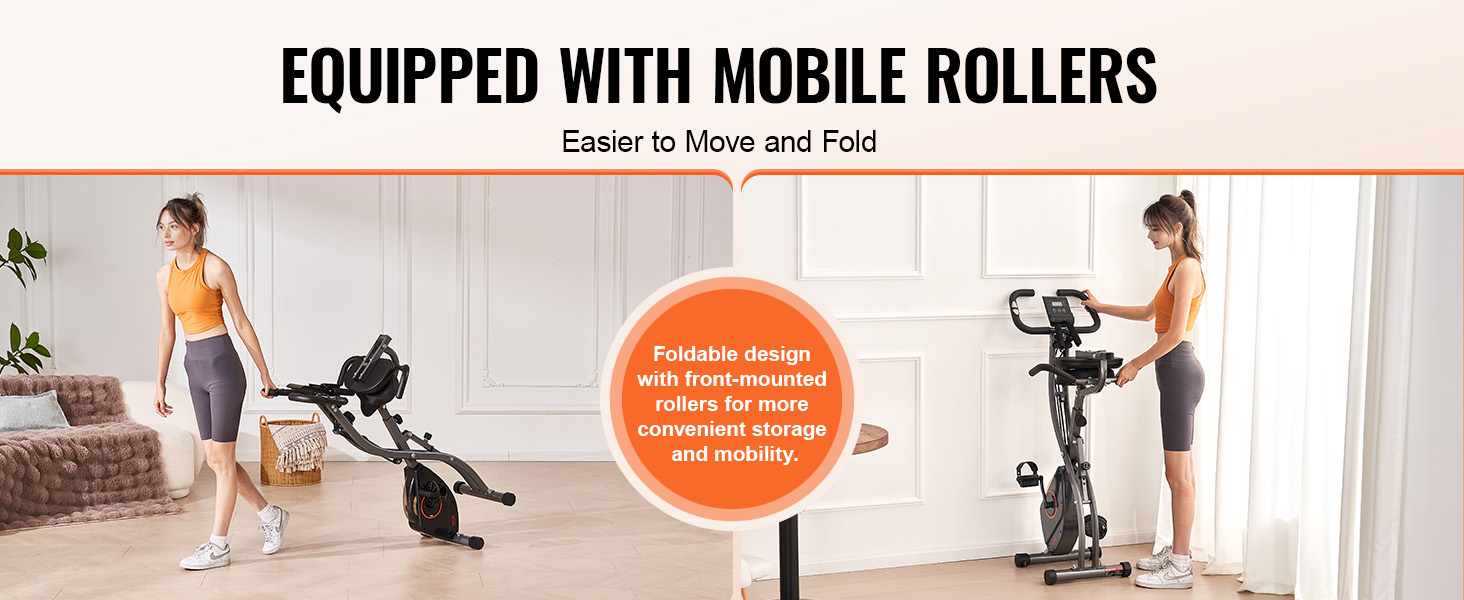 Tento trenažér má skladací dizajn na pohodlné skladovanie a kompaktné šetrenie miesta. Jeho súčasťou sú prepravné kolieska na ľahkú mobilitu.