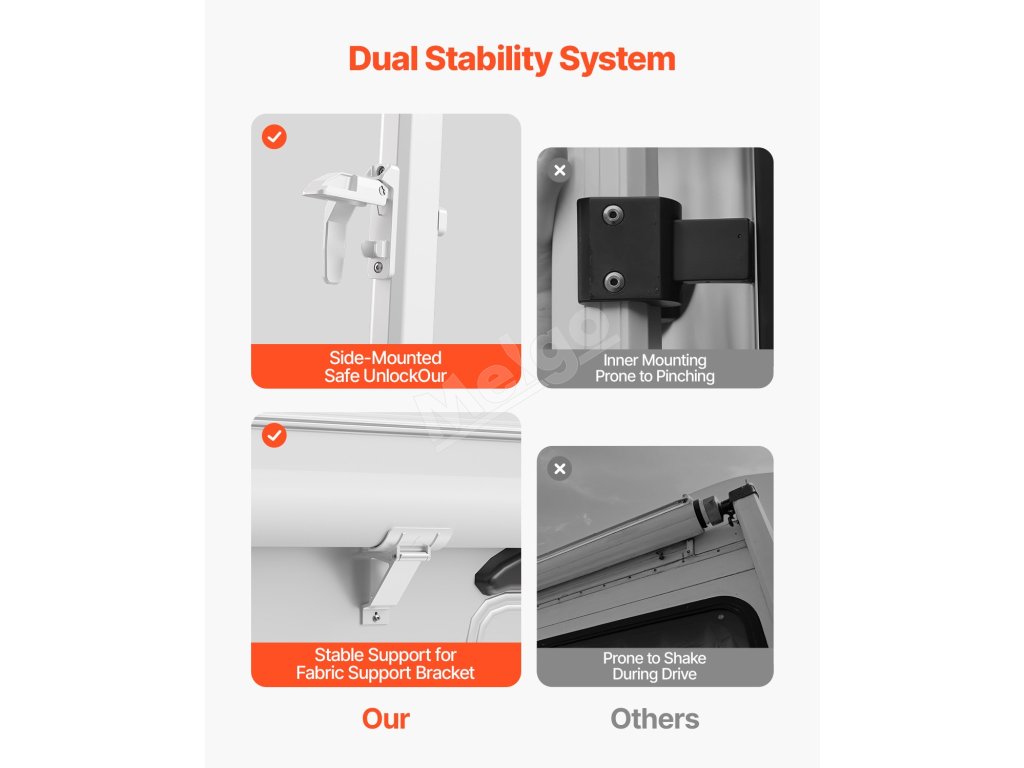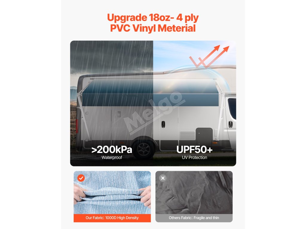 Ponúkame odolnú markízu pre obytné automobily s vylepšenou 18oz 4-vrstvovou PVC vinylovou tkaninou, ktorá je navrhnutá tak, aby odolala premenlivému počasiu. Vystužený rám z hliníkovej zliatiny je vodotesný, odolný voči korózii a zaisťuje dlhodobú stabilitu a trvanlivosť.