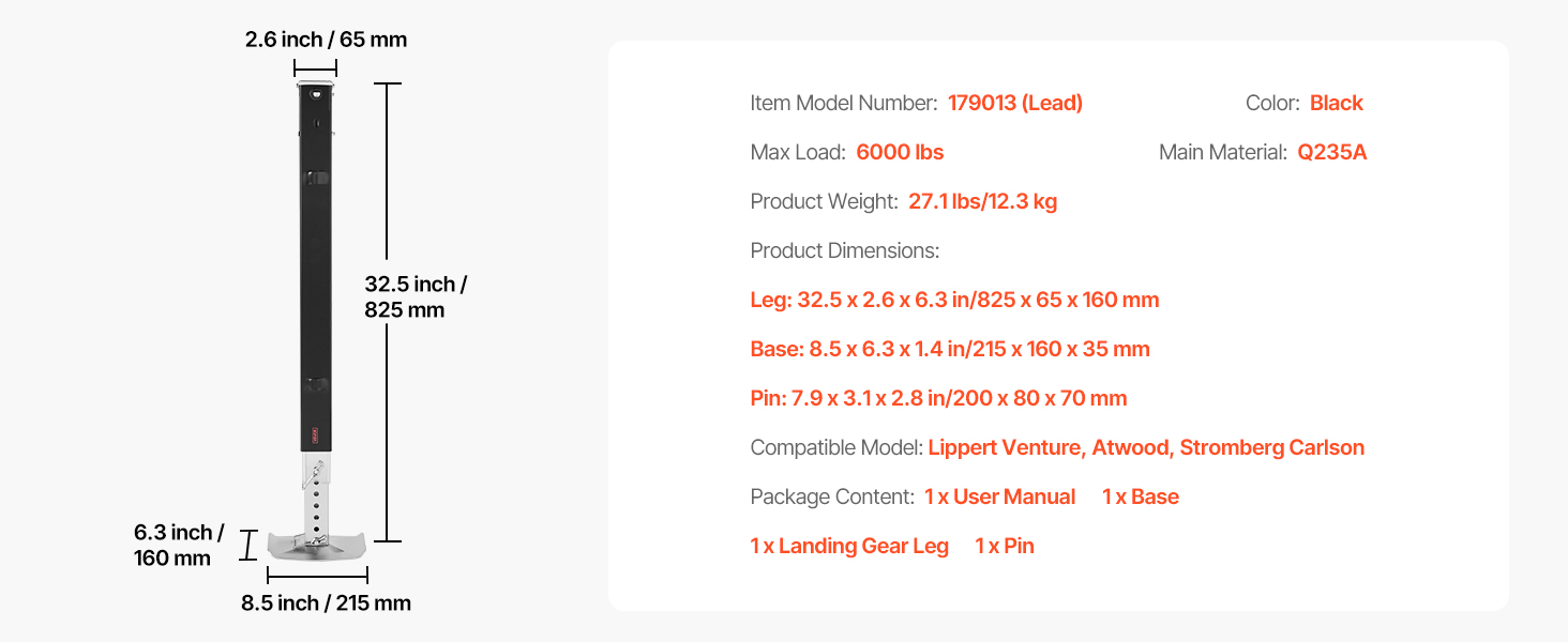 Pred nákupom si dvakrát skontrolujte značku a číslo dielu vášho obytného vozidla, aby ste sa uistili o presnej zhode. Po inštalácii táto podvozková noha poskytuje pevnú a stabilnú oporu na bezpečné parkovanie.
