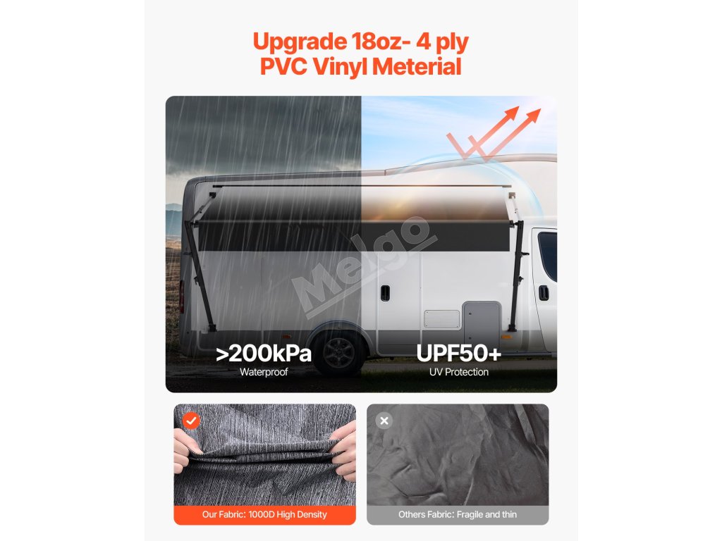 Ponúkame odolnú markízu pre obytné automobily s vylepšenou 18oz 4-vrstvovou PVC vinylovou tkaninou, ktorá je navrhnutá tak, aby odolala premenlivému počasiu. Vystužený rám z hliníkovej zliatiny je vodotesný, odolný voči korózii a zaisťuje dlhodobú stabilitu a trvanlivosť.