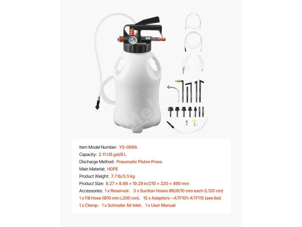 Pneumatické čerpadlo na prevodový olej 8 l, 15 adaptérov, hdpe nádrž