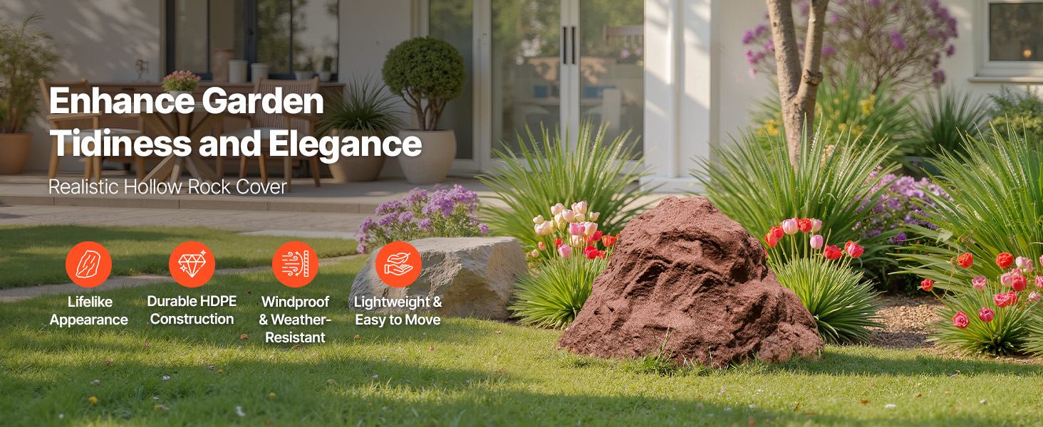 Exteriér z umelého kameňa sa dokonale začleňuje do prírodných podmienok a ľahko zakrýva neporiadok, ako sú poklopy kanálov a rúry. Náš kryt z umelého kameňa zvyšuje čistotu a vizuálnu príťažlivosť záhrady a vytvára skvelý vonkajší priestor.