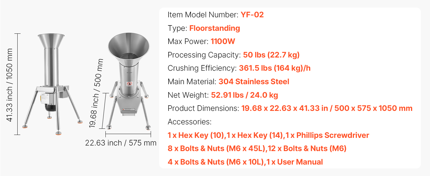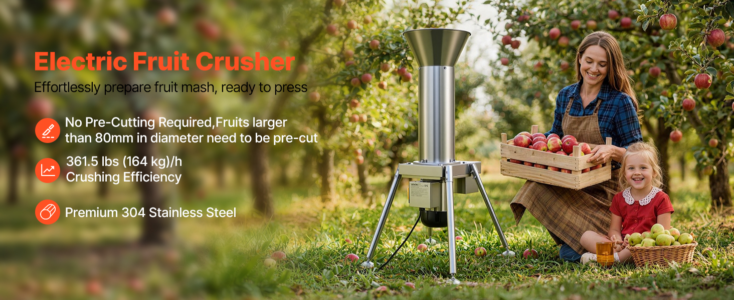 Tento elektrický drvič jabĺk efektívne drví celé plody na jemnú kašu, čím zvyšuje efektivitu lisovania a výťažnosť šťavy. Je vhodný pre rôzne druhy tvrdého ovocia a zeleniny, ideálny na výrobu domáceho cideru, odšťavovanie a domáce varenie piva.