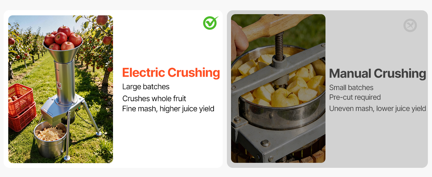 V porovnaní s ručným drvením tento elektrický drvič ovocia spracováva väčšie dávky, drví celé plody a produkuje konzistentnejšiu kašu, čím pomáha zlepšiť extrakciu šťavy a zároveň znižuje pracovnú náročnosť a čas prípravy.