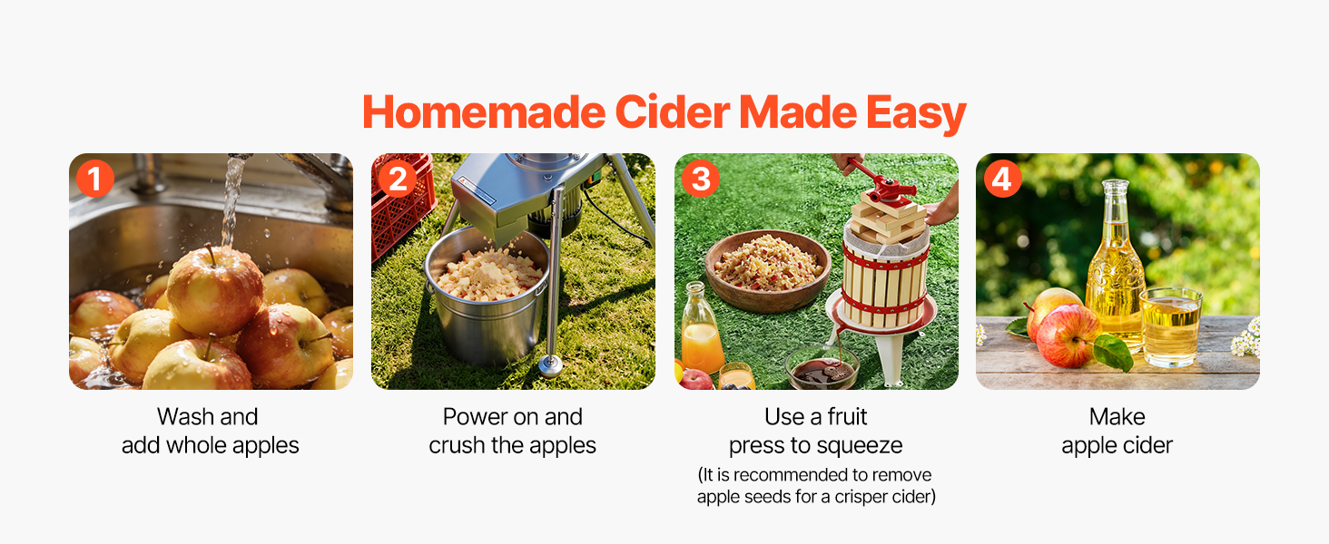 Stačí vložiť celé jablká, zapnúť drvič, aby ich rozdrvil na kašu, a potom použiť lis na ovocie na extrakciu čerstvého cideru alebo šťavy, čím sa domáce varenie cideru a príprava nápojov stane rýchlou a pohodlnou záležitosťou.