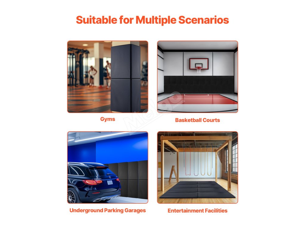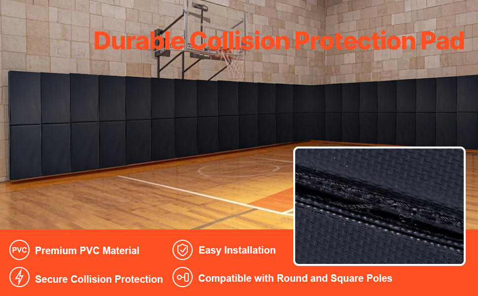 Toto polstrovanie stien v telocvični, vyrobené z prvotriedneho PVC materiálu, je odolné proti opotrebovaniu a roztrhnutiu, vďaka čomu časom nevybledne ani sa nedeformuje. Plochá konštrukcia s veľkými rozmermi umožňuje spojenie viacerých chráničov na vyplnenie celých stien, čím sa znižuje náraz pre športovcov. Jednoduchá inštalácia, ktorá poskytuje bezpečnosť pri hre.