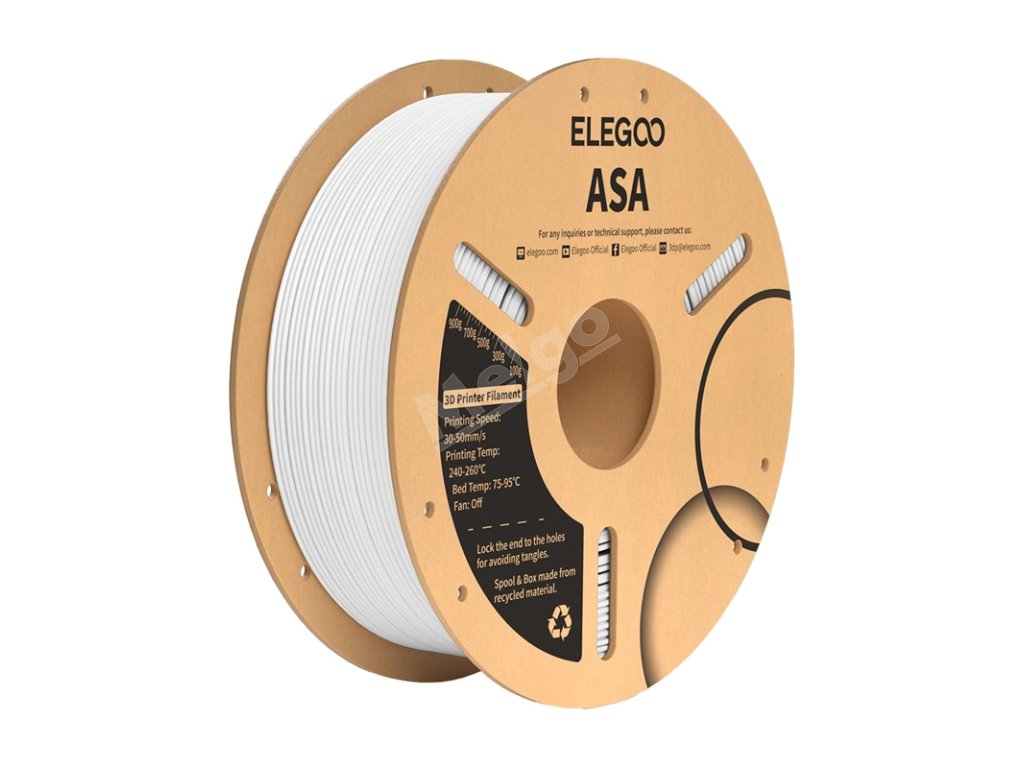 Filament ELEGOO ASA (akrylonitril-styrén-akryl - plast odolný voči poveternostným vplyvom) v bielej farbe sa výborne hodí na projekty, ktoré budú vystavené slnku, dažďu alebo vysokým teplotám. Materiál nezmení farbu, nepraská a zostane odolný aj po dlhom čase vonku. Vďaka tomu sa výborne hodí na tlač záhradných, technických a dekoratívnych prvkov.