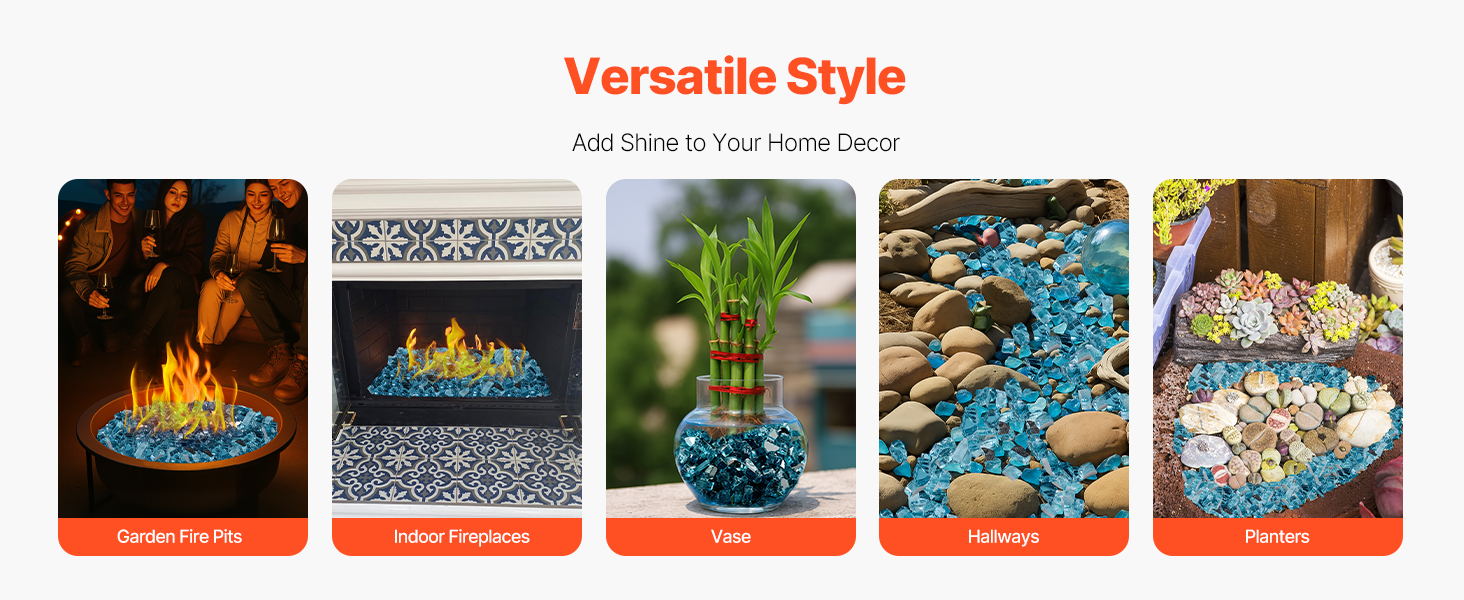 Naše žiarivé, farebné dekoratívne kúsky vyrobené z prvotriedneho ohňového skla sú odolné a zvládajú teplo. Nerozpúšťajú sa, neprodukujú dym ani popol. Stačí ich rýchlo utrieť a opäť získajú lesk. Sú ideálne pre ohniská, krby a záhrady a bez námahy dodajú vášmu domovu iskru.