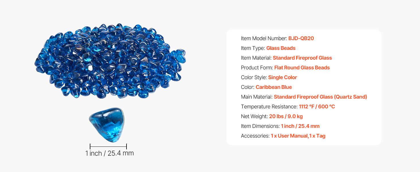 Sklenené kamienky do krbu 20 lbs/9 kg, 1 inch/25.4 mm, karibská modrá