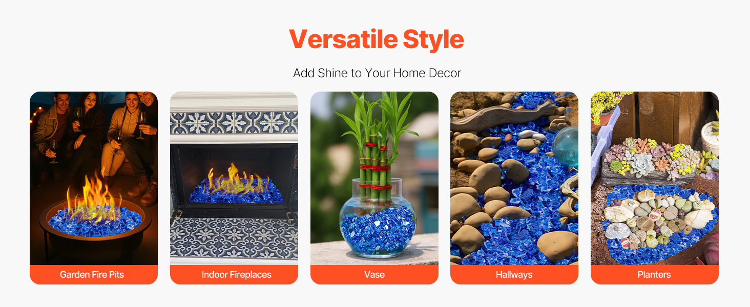 Naše žiarivé, farebné dekoratívne kúsky vyrobené z prvotriedneho ohňového skla sú odolné a zvládajú teplo. Nerozpúšťajú sa, nepraskajú, nevytvárajú dym ani popol. Stačí ich rýchlo utrieť a opäť získajú lesk. Sú ideálne do ohnísk, krbov a záhrad a bez námahy dodajú vášmu domovu iskru.