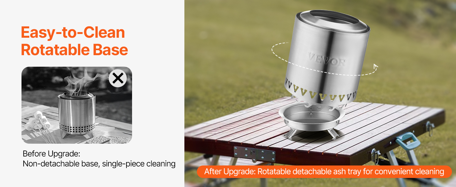 Tento stolový krb vybavený otočnou odnímateľnou základňou sa ľahko čistí. Ľahko odstráňte všetky zvyšky paliva, čo vám zabezpečí pohodlné a upratané vonkajšie prostredie.