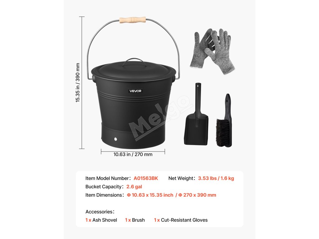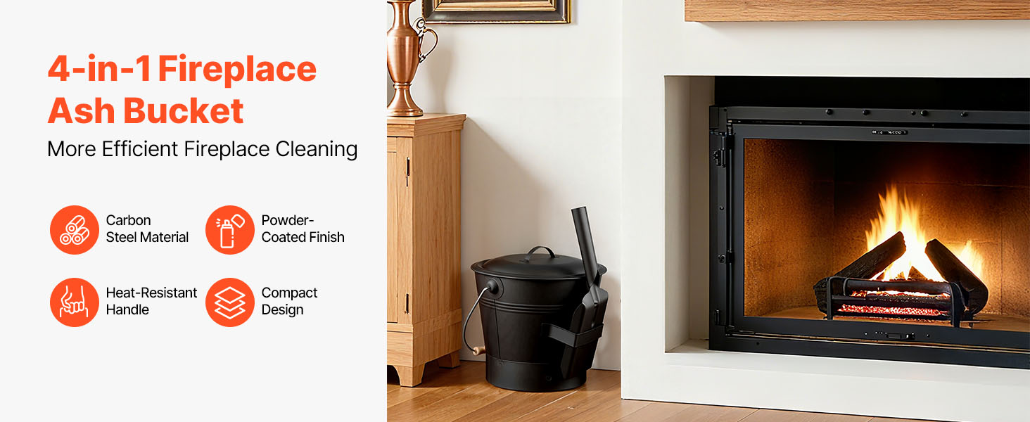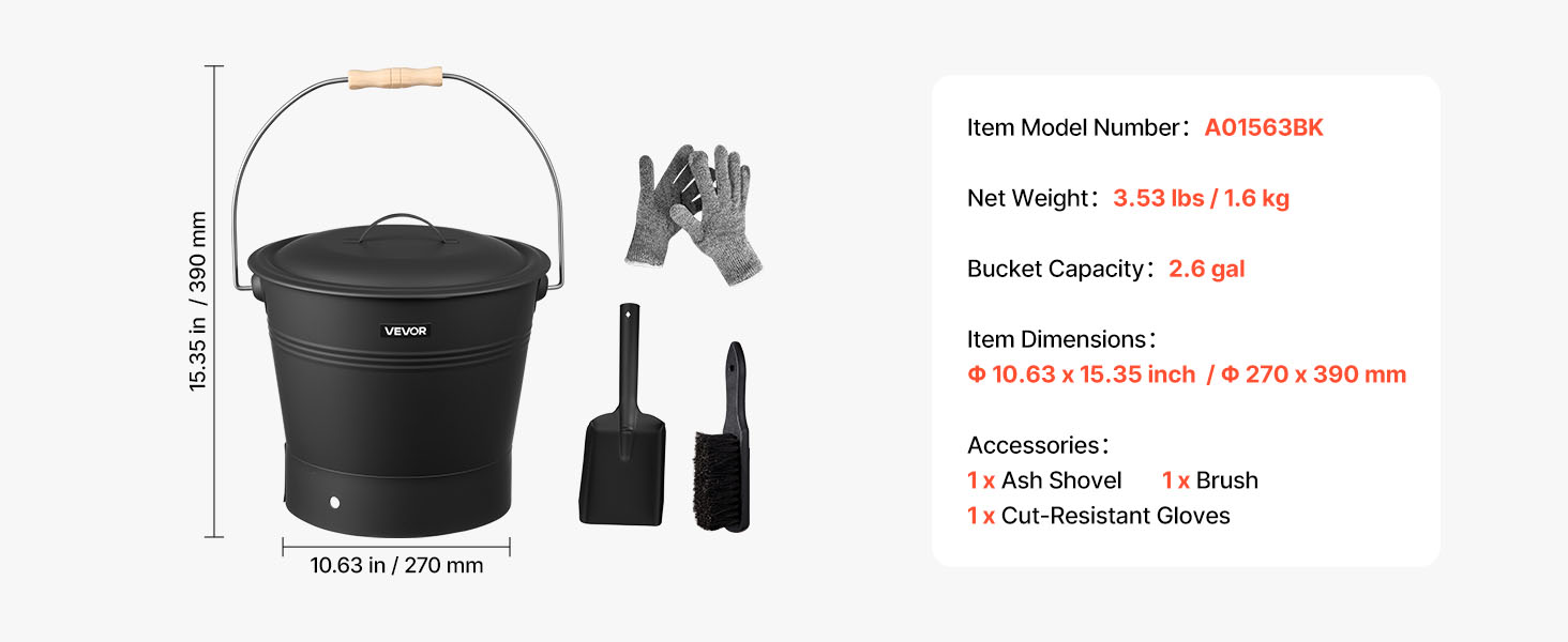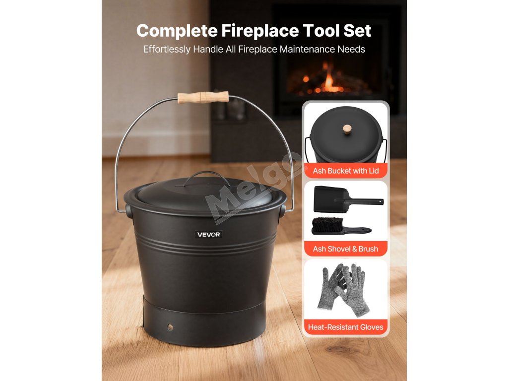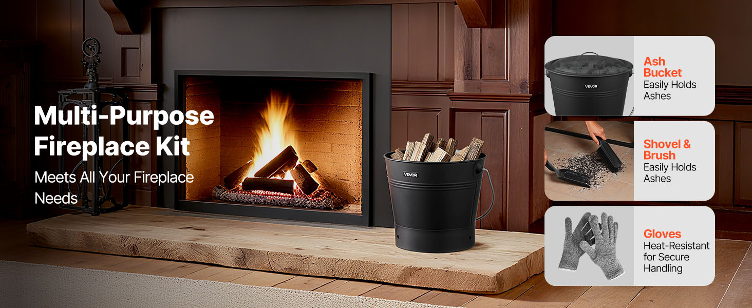 Táto súprava vedra na popol z krbu obsahuje veľké vedro na popol a zvyšky dreva, lopatku a kefu na rýchle čistenie a žiaruvzdorné rukavice na ochranu rúk. Všetky nástroje pracujú spoločne, čím prinášajú časovo úspornejšie a prácnejšie čistenie krbu.