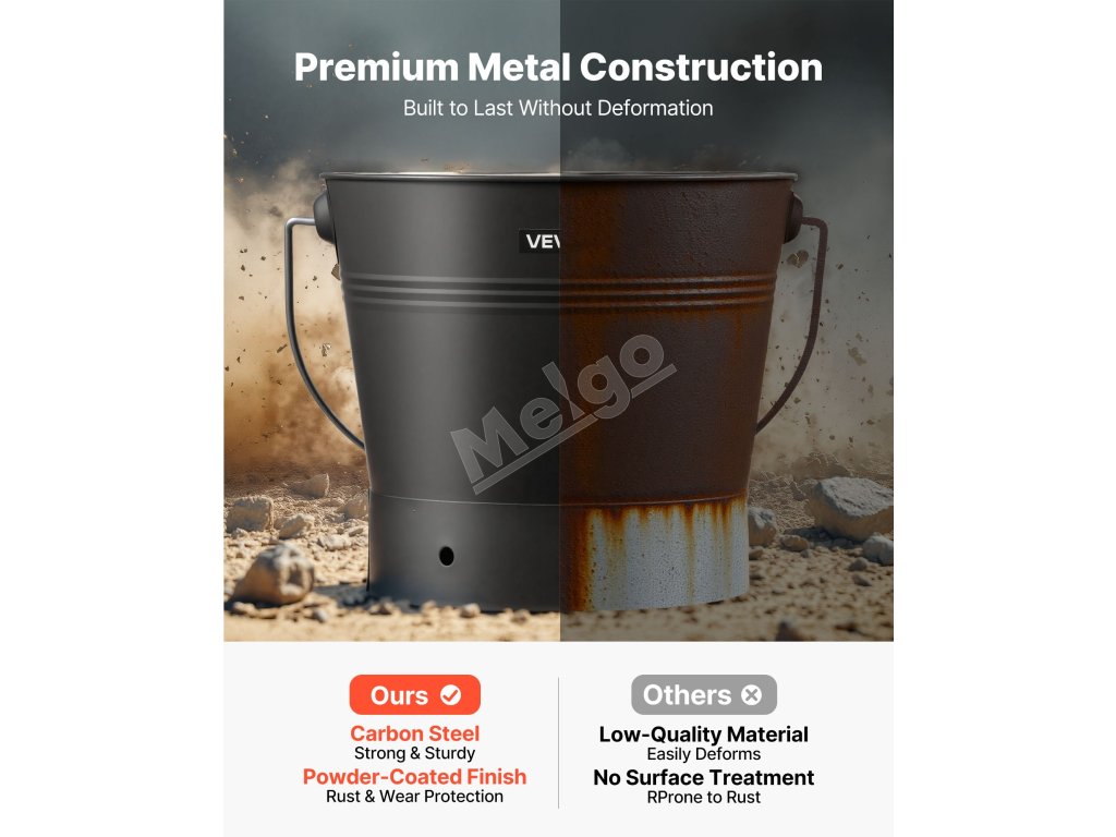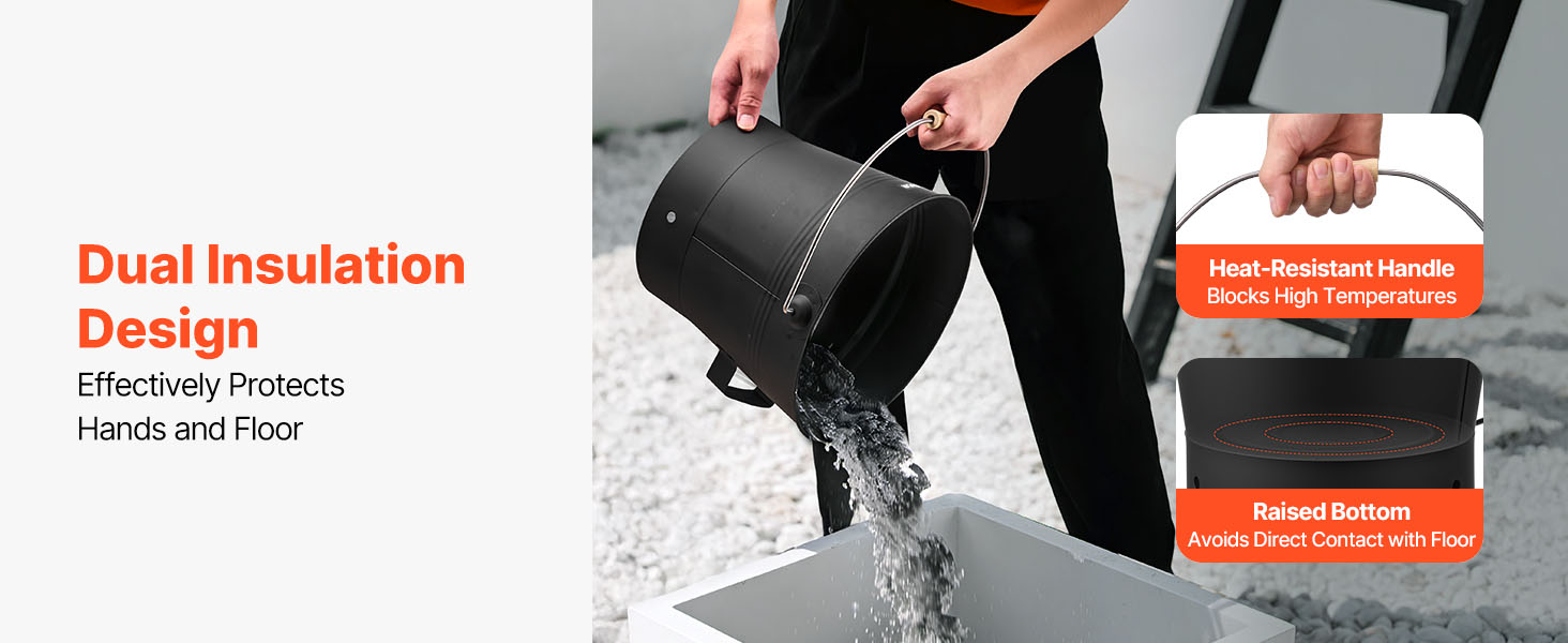 Vedro na popol s vekom využíva dvojitý tepelnoizolačný dizajn. Zostavené s tepelne odolnou rukoväťou na blokovanie vysokého tepla na ochranu rúk. Zvýšené dno udržiava vedro mimo podlahy, čím sa predchádza poškodeniu podlahy teplom. Táto dvojitá ochrana vám zaručuje bezpečné a pohodlné používanie.