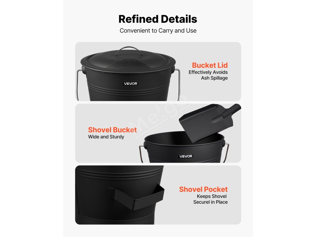 Krbové vedro na popol je vyrobené z vybranej kvalitnej uhlíkovej ocele s práškovou povrchovou úpravou a je odolné voči ohýbaniu, hrdzi a vysokému teplu, čo zaručuje dlhodobú životnosť. Ergonomické predĺžené rukoväte poskytujú pohodlné uchopenie odolné voči teplu, čo je nevyhnutný pomocník pri používaní krbu.