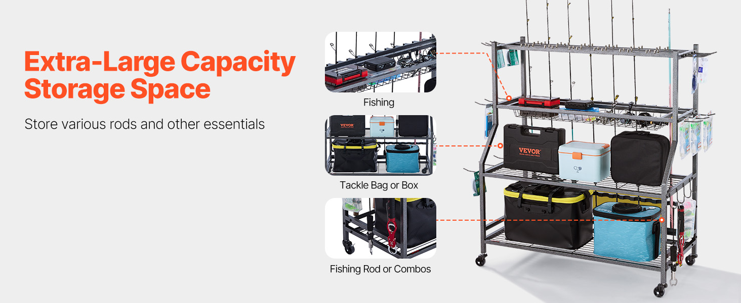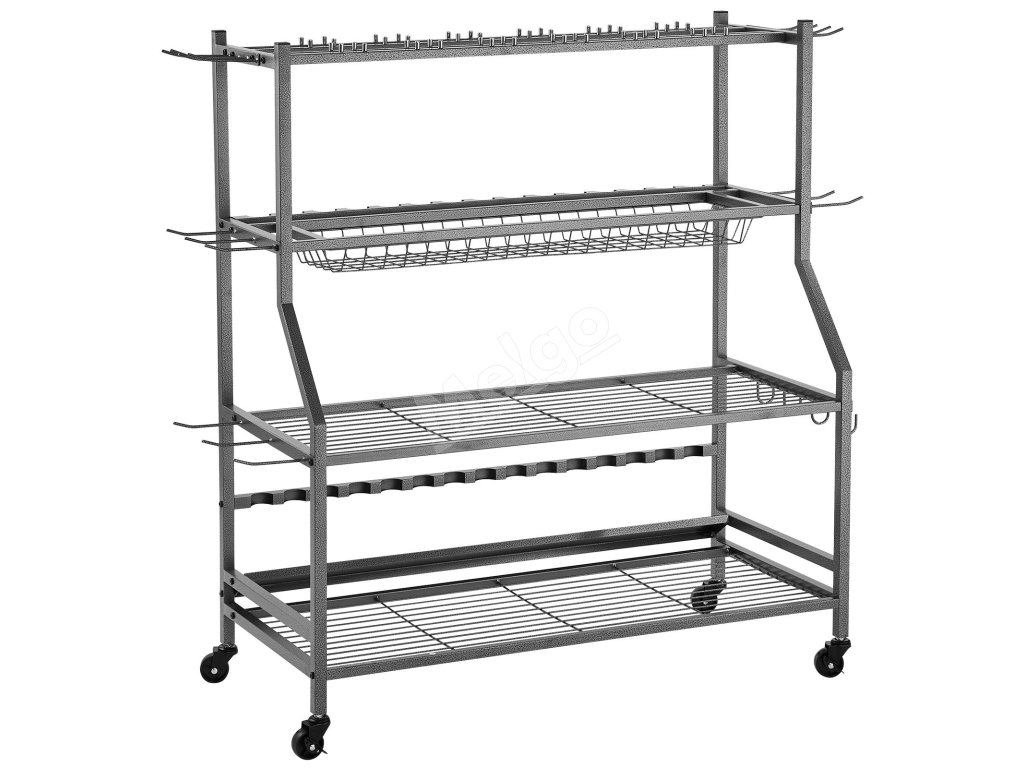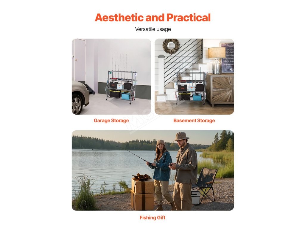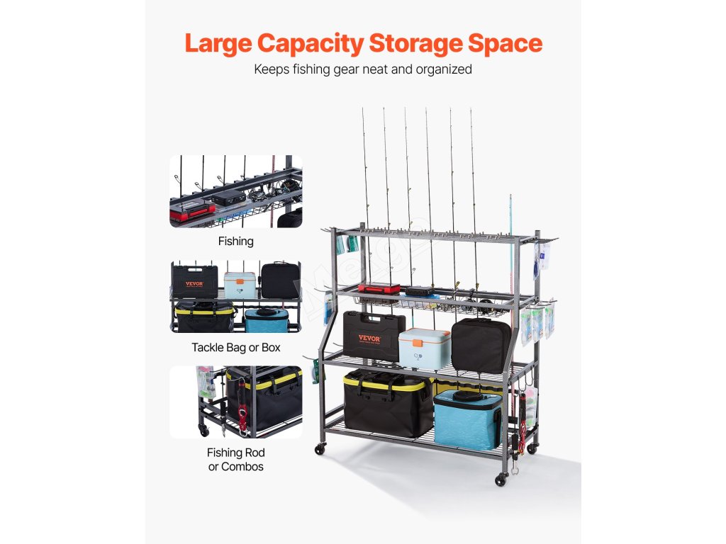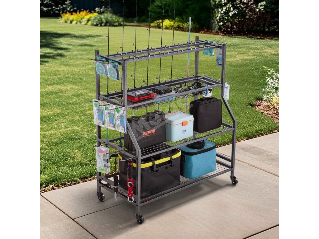 Stojan na rybárske prúty má viacvrstvovú konštrukciu, ktorá poskytuje dostatok úložného priestoru na udržanie poriadku v rybárskom vybavení. Je ideálny na uloženie boxov na náčinie, návnad, navijakov a ďalších potrebných vecí.