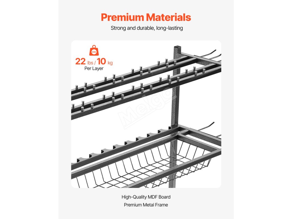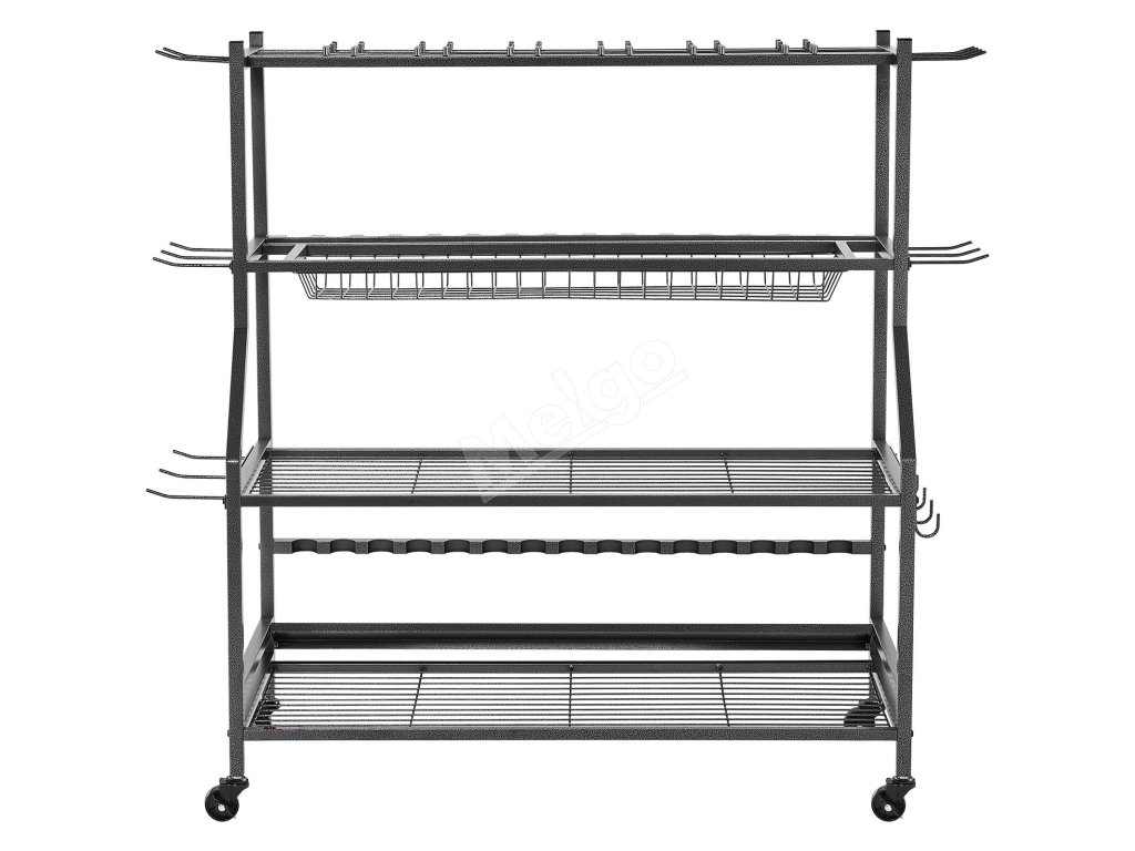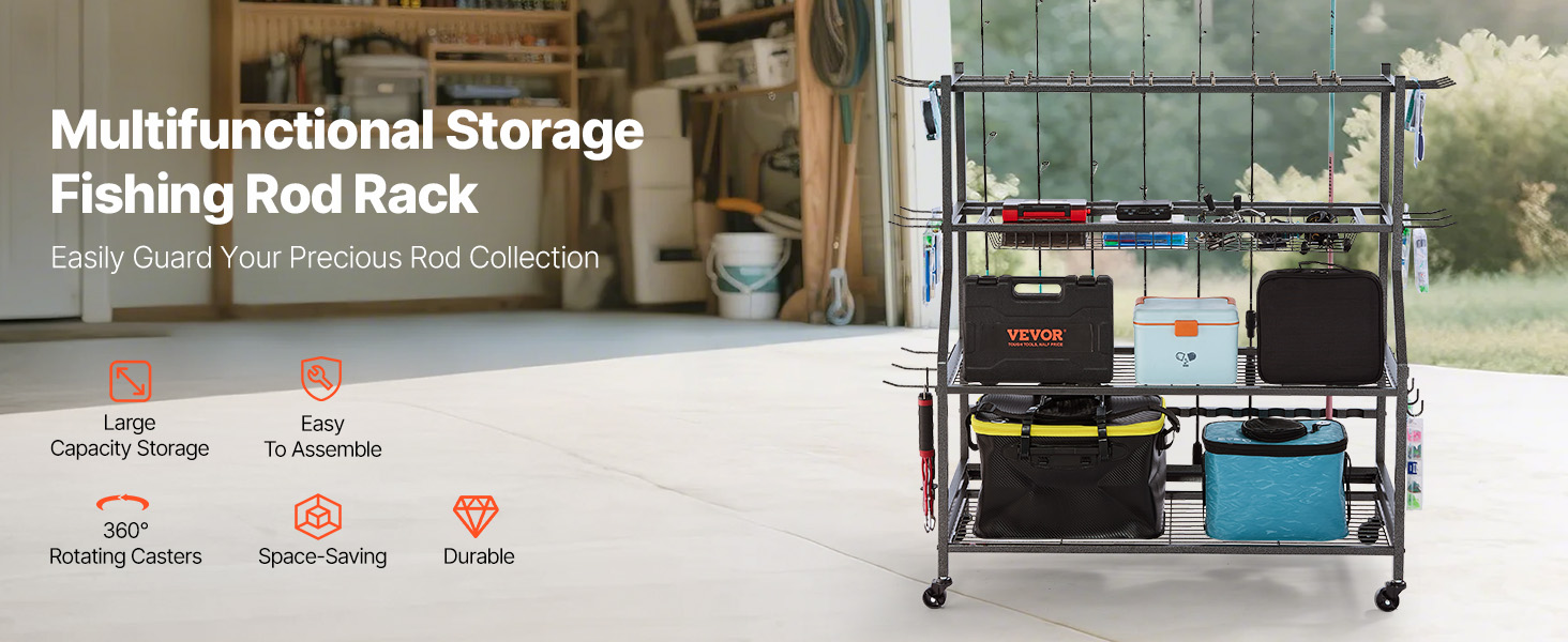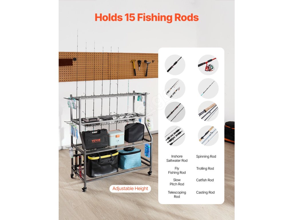 Stojan na rybárske prúty má viacvrstvovú konštrukciu, ktorá poskytuje dostatok úložného priestoru na udržanie poriadku v rybárskom vybavení. Je ideálny na uloženie boxov na náčinie, návnad, navijakov a ďalších potrebných vecí.