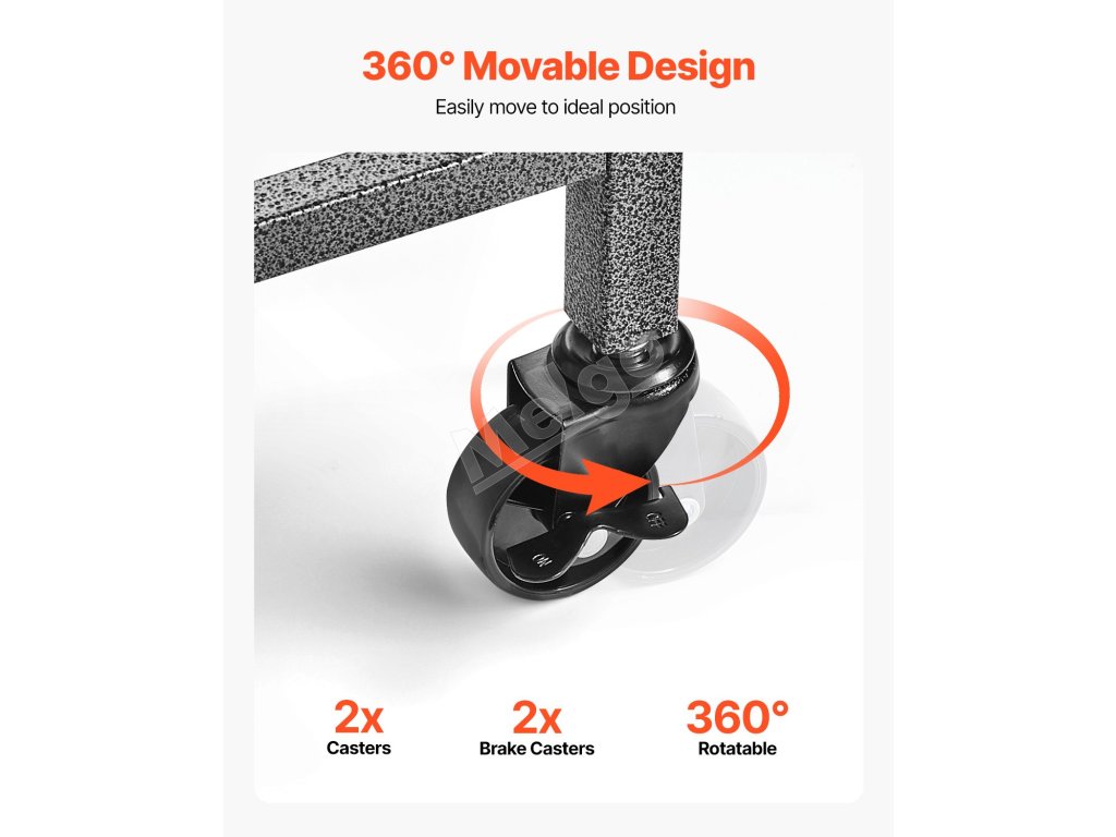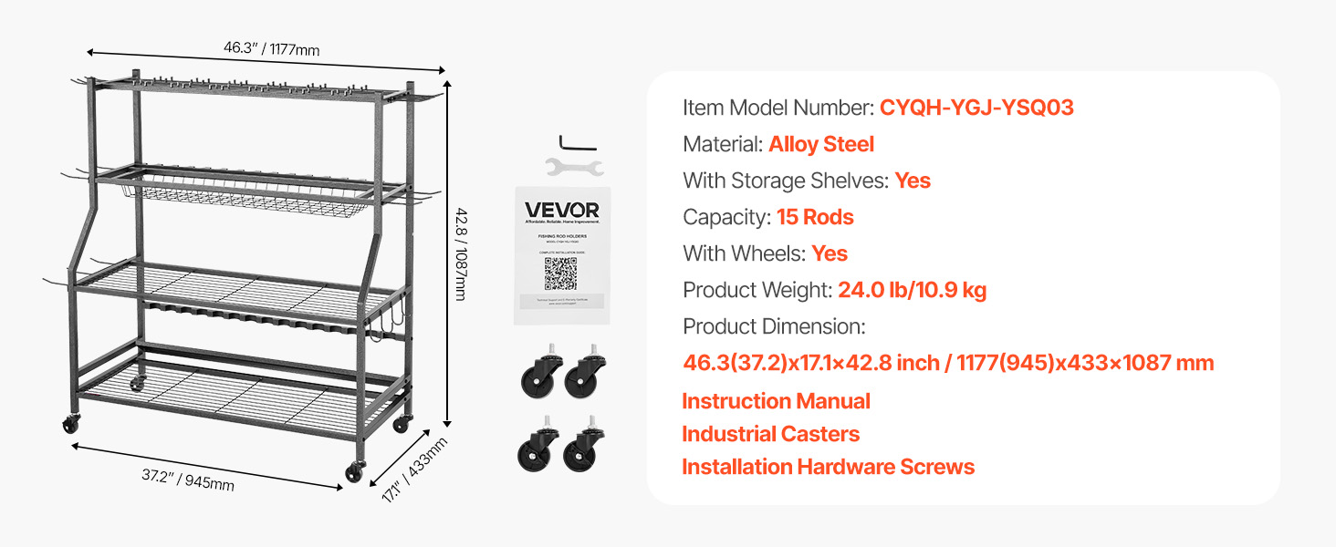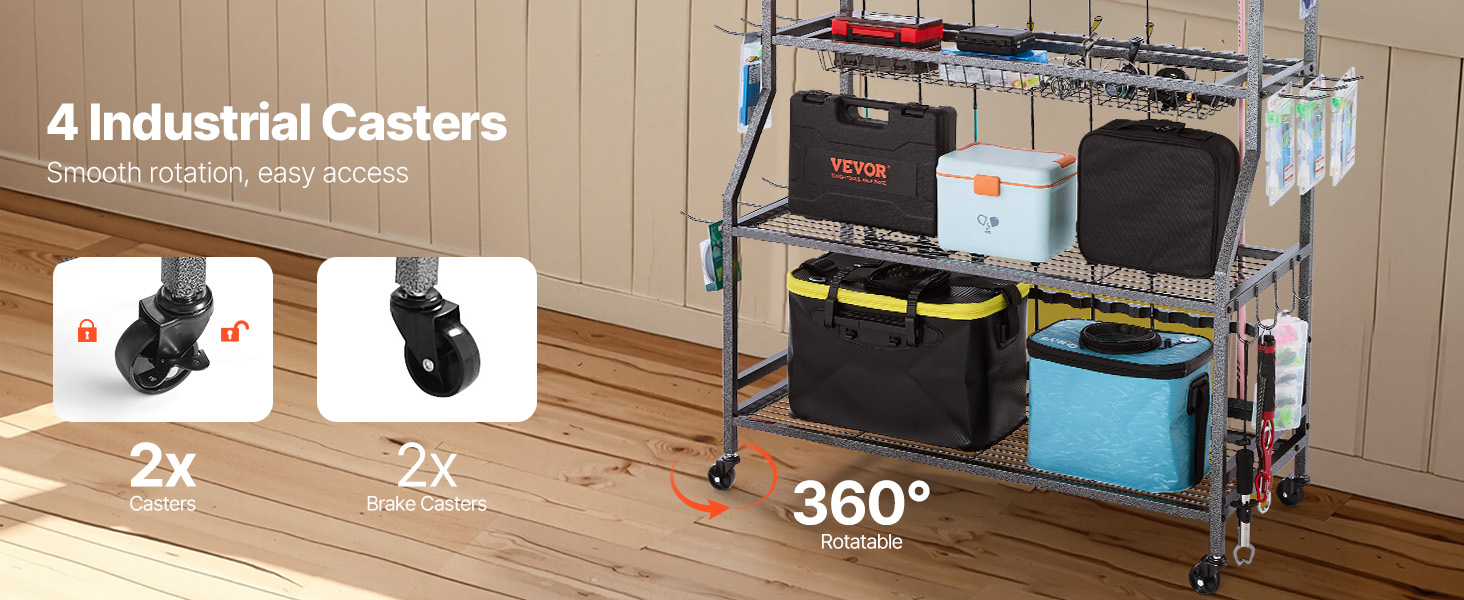Vybavenie na rybárske náčinie je vybavené 4 priemyselnými kolieskami, ktoré sa plynulo otáčajú o 360 stupňov bez prestávok. Kolieska majú brzdy na jednoduché upevnenie, vďaka čomu je rybárske vybavenie prístupnejšie.