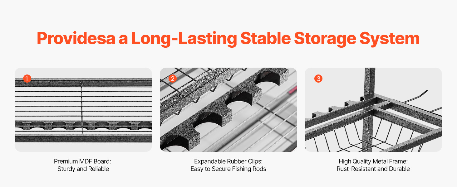 Vozík na rybárske prúty je vyrobený z vysokokvalitných materiálov, čo výrazne zvyšuje celkovú kvalitu a odolnosť. Rozšíriteľné gumové klipy po stranách pomáhajú upevniť rôzne prúty. Prémiová doska MDF s vysokou hustotou v spojení s kvalitným kovovým rámom zabezpečuje stabilitu.