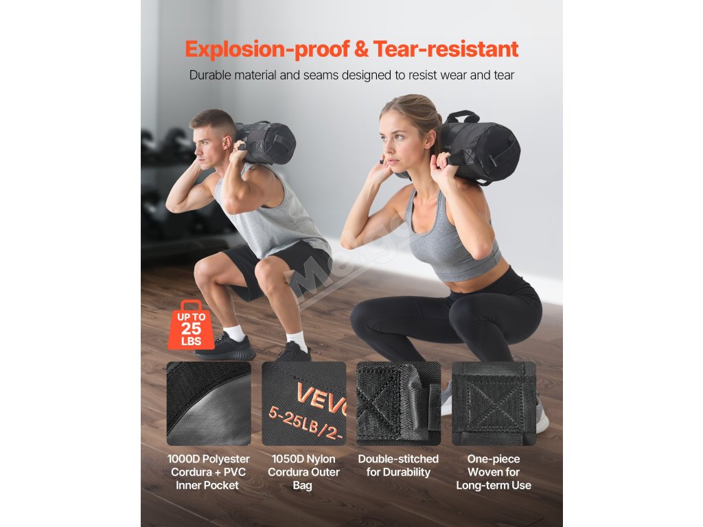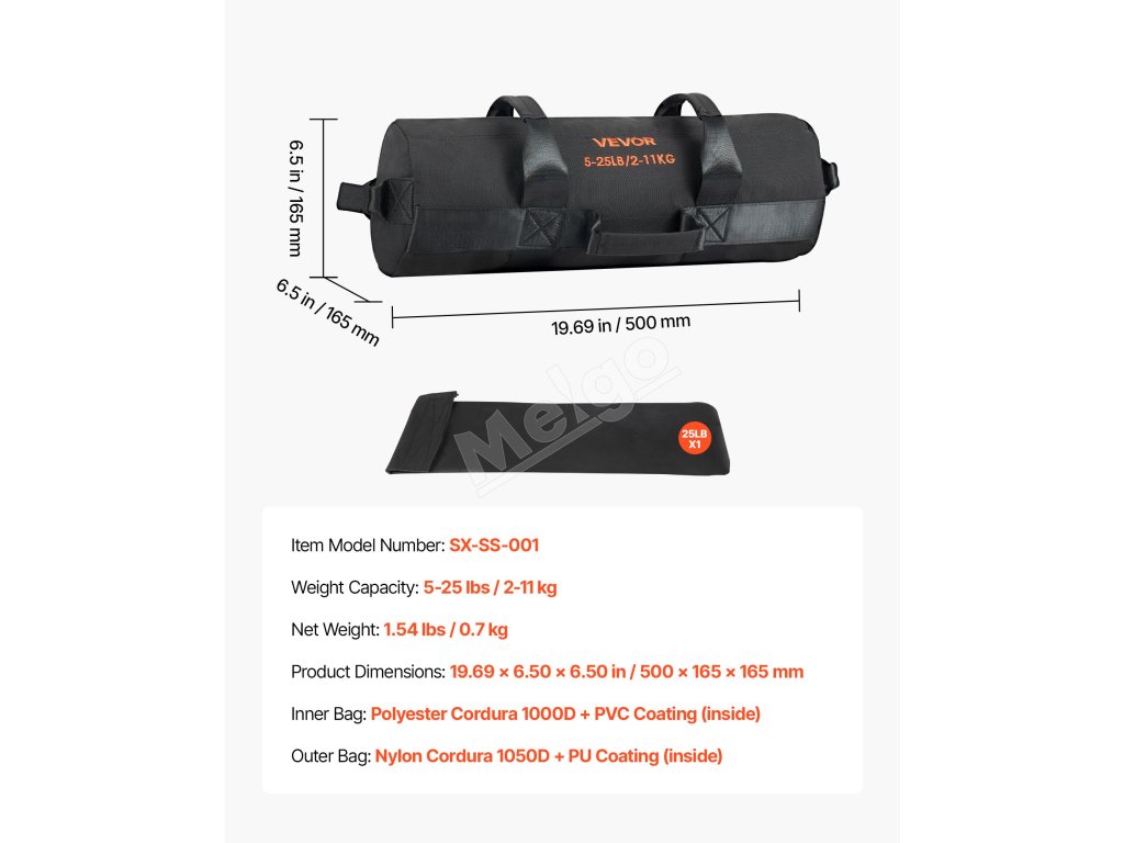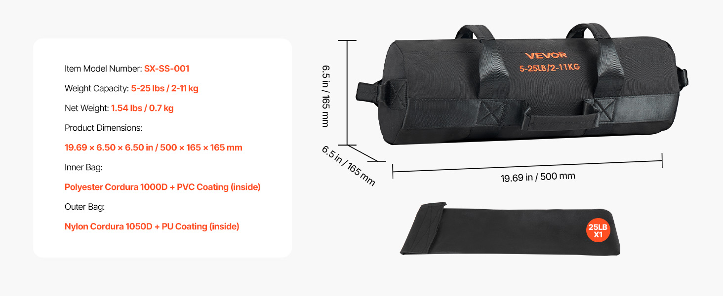 Naše vrecko na piesok na silový tréning má vnútorné vrecko z polyesteru Cordura 1000D s PVC povlakom a vonkajšie vrecko s tkanou rukoväťou po celej dĺžke. Odoláva nárazom pri úderoch, pádoch a ťahaní, poskytuje trvanlivosť a odolnosť proti deformácii a praskaniu, čím zaisťuje bezpečnosť tréningu.