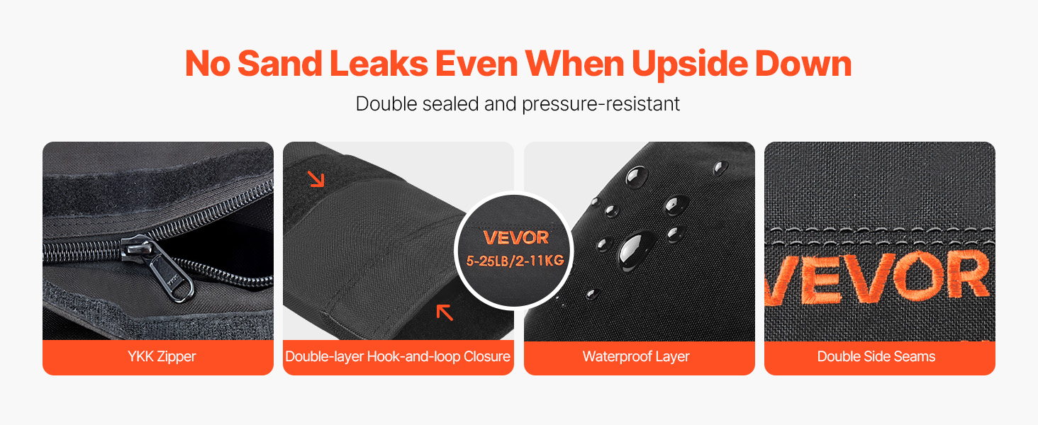 Toto nastaviteľné vrecko na piesok je vybavené zipsami YKK a ďalšími tesniacimi materiálmi odolnými voči tlaku, ktoré zaisťujú, že piesok neunikne ani pri intenzívnom kotúľaní, čím poskytuje dlhotrvajúcu ochranu pre váš tvrdý tréning.