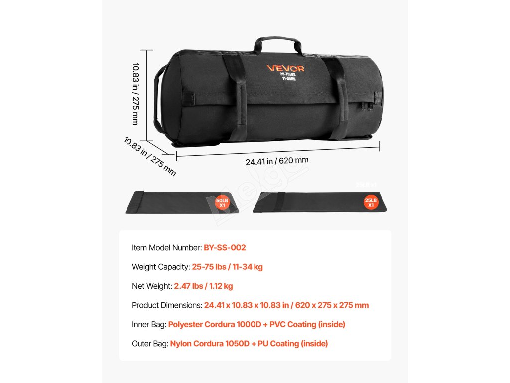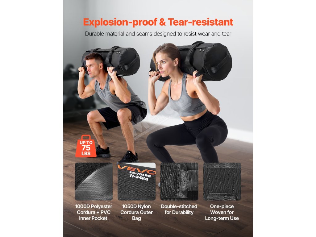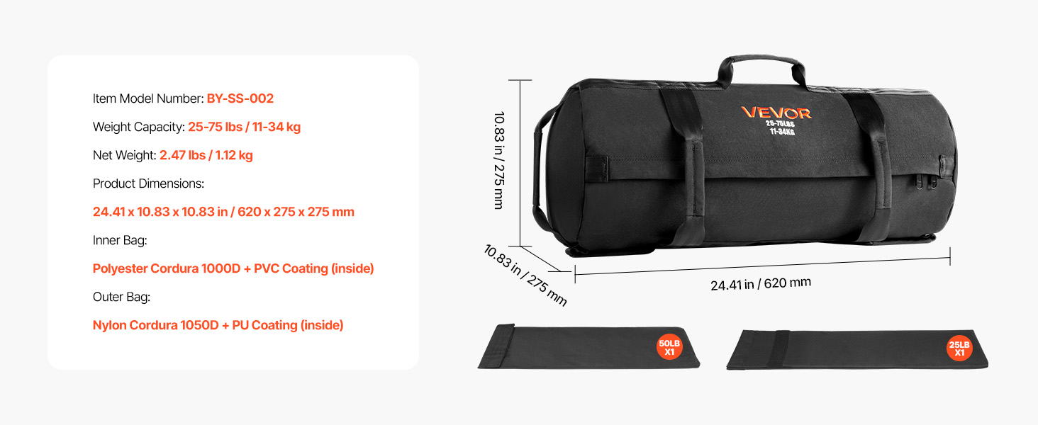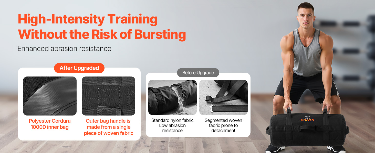 Naše vrecko na piesok na silový tréning má vnútorné vrecko z polyesteru Cordura 1000D s PVC povrchovou úpravou a vonkajšie vrecko s tkanou rukoväťou po celej dĺžke. Odoláva nárazom pri úderoch, pádoch a ťahaní, poskytuje trvanlivosť a odolnosť proti deformácii a praskaniu, čím zaisťuje bezpečnosť tréningu.