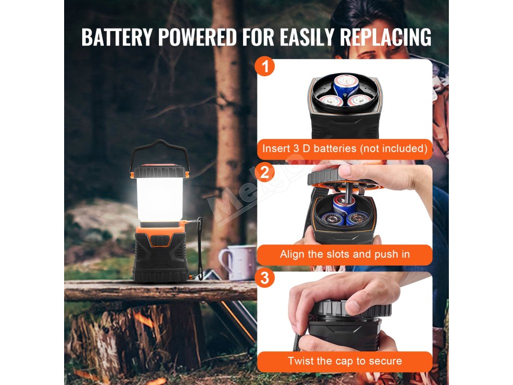 Naša kempingová baterka používa 3 batérie typu D-Cell (nie sú súčasťou balenia). V prípade potreby sa dá jednoducho rozobrať a vymeniť batérie. Jednoduchá oprava znamená menej starostí a viac radosti z vašich výletov do prírody.