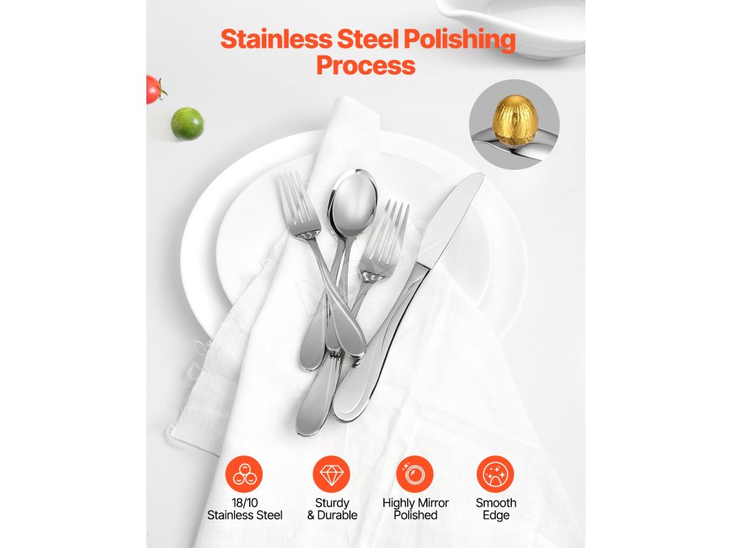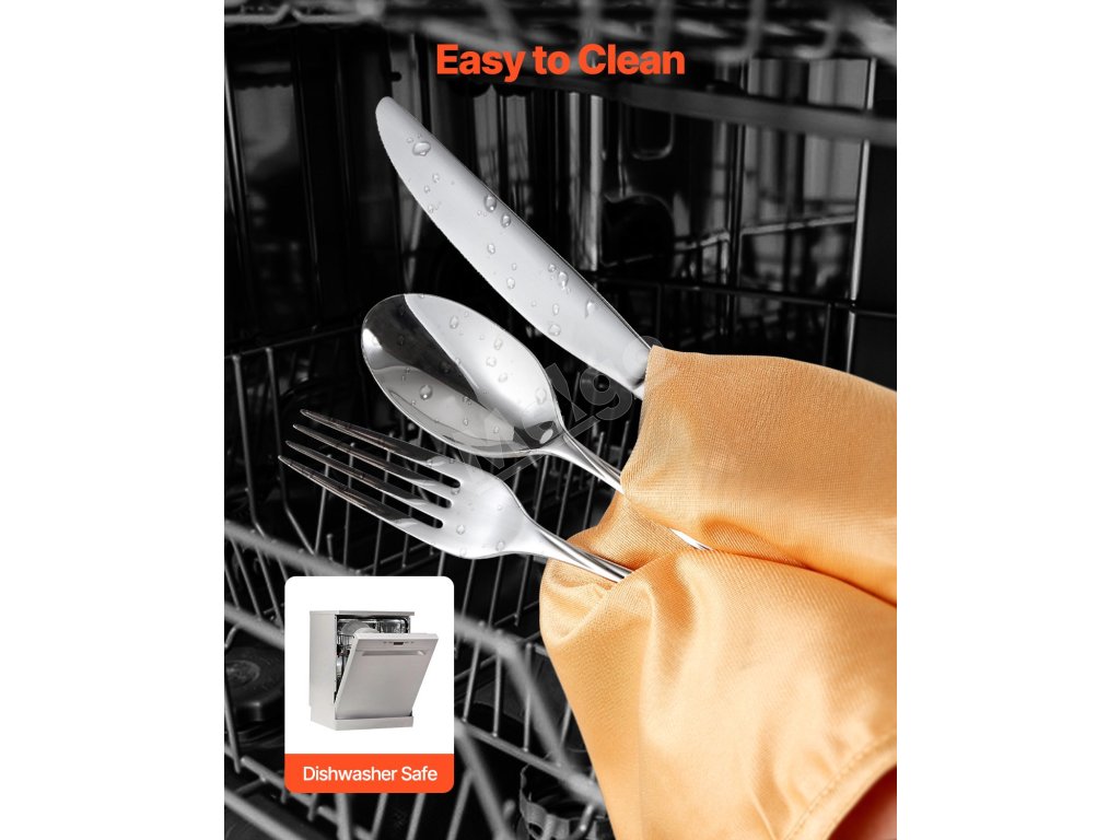 Táto súprava príborov je vyrobená z prvotriednej nehrdzavejúcej ocele 18/10, je odolná, nehrdzavejúca a dobre vyvážená. Dizajn s hladkými hranami poskytuje pohodlie počas používania. Dá sa umývať v umývačke riadu, má ideálnu hmotnosť a hrúbku na jednoduchú manipuláciu, čo zaručuje dlhodobú životnosť.