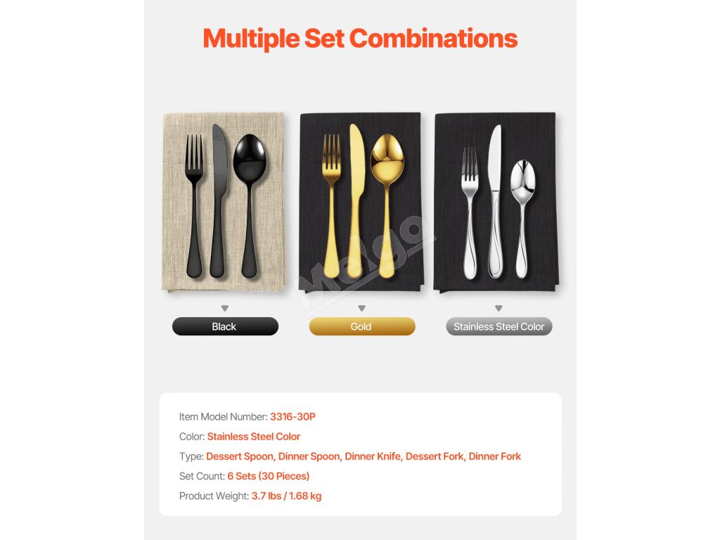 Táto súprava obsahuje kombináciu 2 typov lyžíc, 2 typov vidličiek a 1 typu noža, vrátane dezertných lyžíc, obedových lyžíc, obedových nožov, dezertných vidličiek a vidličiek na večeru, ktoré spĺňajú vaše každodenné potreby pri stolovaní.