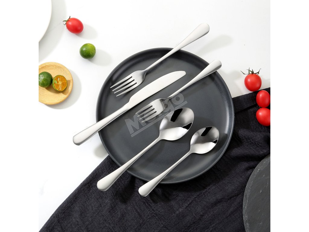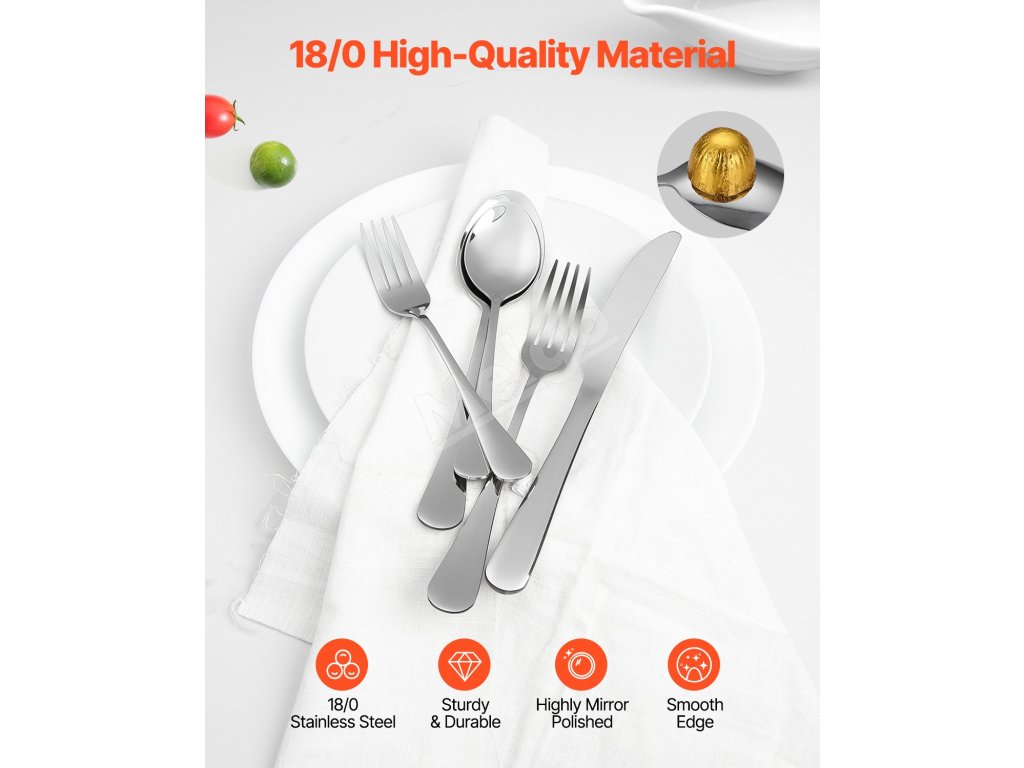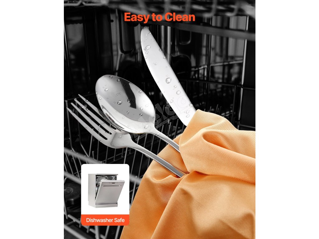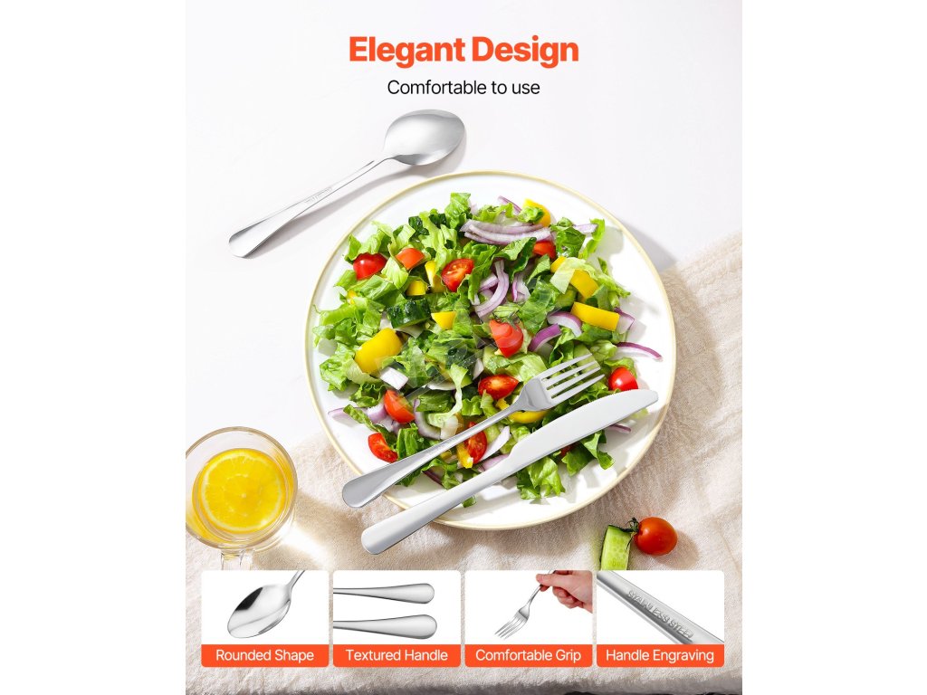 Táto súprava príborov je vyrobená z prvotriednej nehrdzavejúcej ocele 18/0, je odolná, nehrdzavejúca a dobre vyvážená. Dizajn s hladkými hranami poskytuje pohodlie počas používania. Dá sa umývať v umývačke riadu, má ideálnu hmotnosť a hrúbku na jednoduchú manipuláciu, čo zaručuje dlhodobú životnosť.