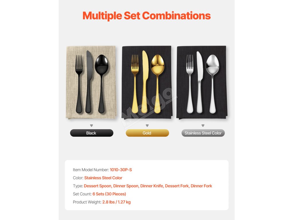 Táto súprava obsahuje kombináciu 2 typov lyžíc, 2 typov vidličiek a 1 typu noža, vrátane dezertných lyžíc, obedových lyžíc, obedových nožov, dezertných vidličiek a vidličiek na večeru, ktoré spĺňajú vaše každodenné potreby pri stolovaní.